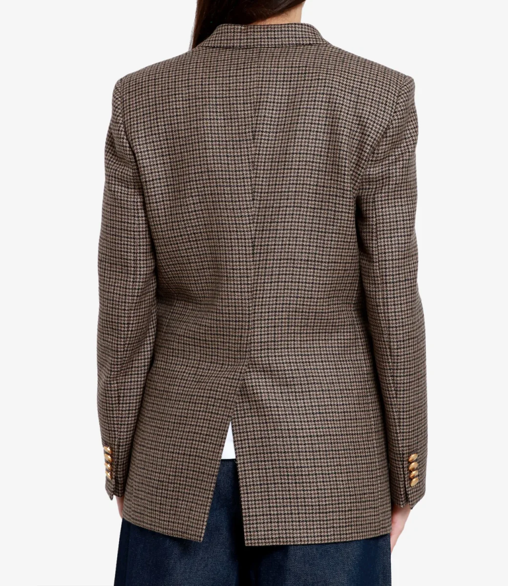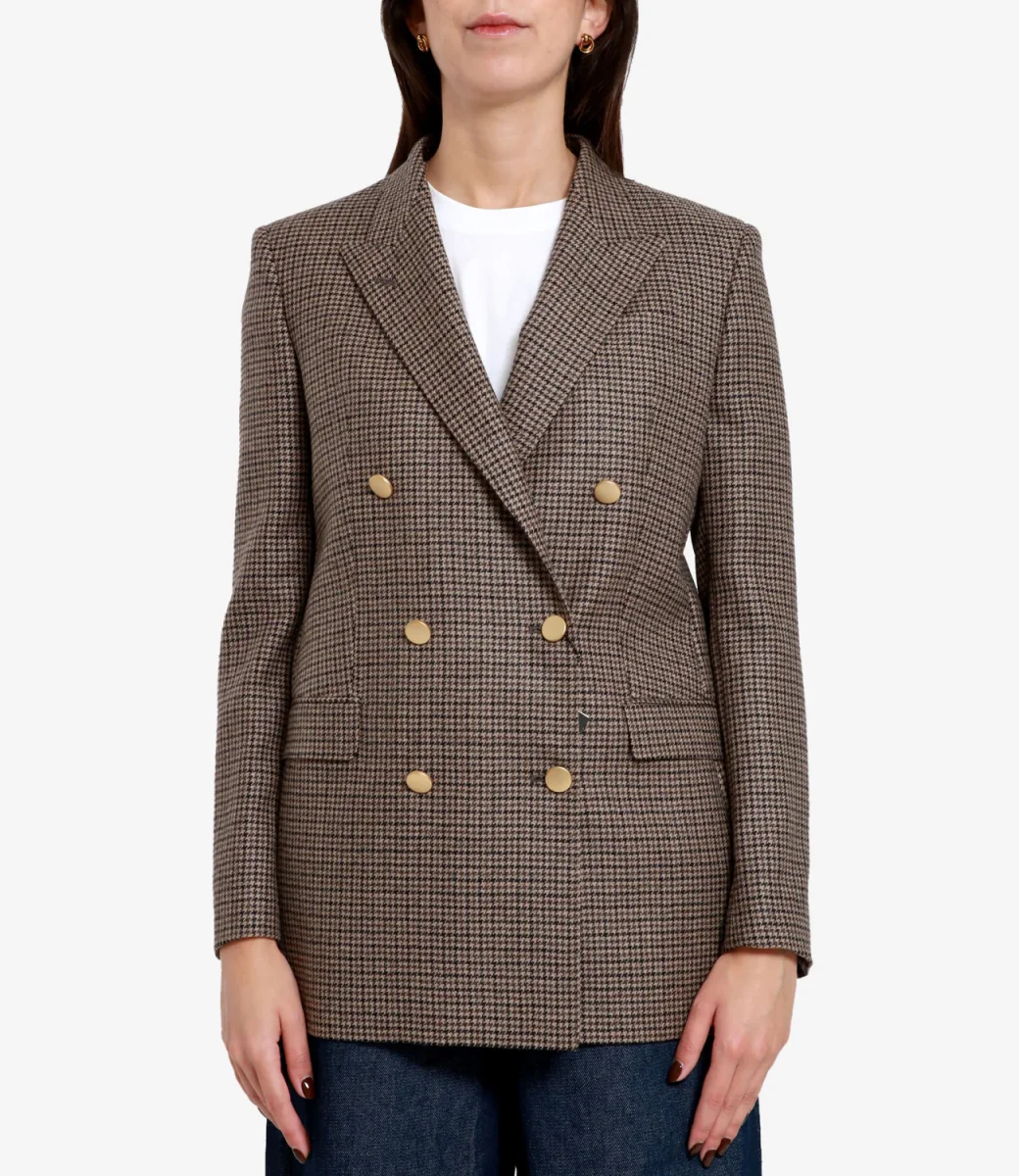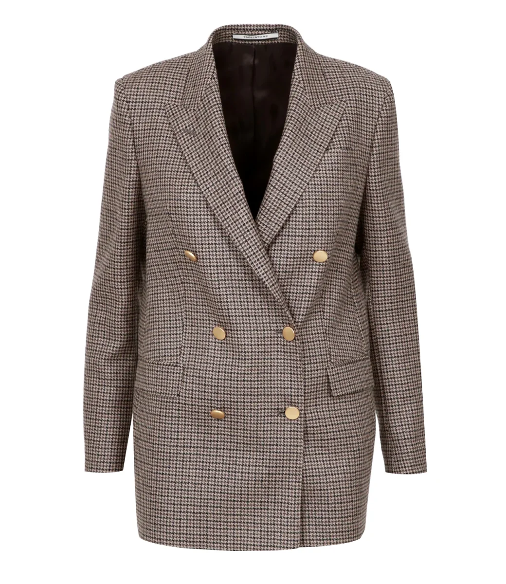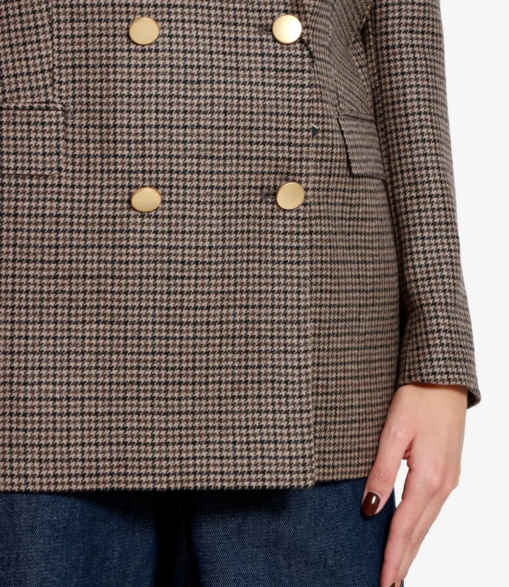 Giacca Tagliatore J-Jasmine10B in tessuto in lana con motivo pied de poule, modello doppiopetto con chiusura bottoni dorati, revers classico stretto, taschino sul petto lato sinistro, tasche con patta, manica lunga con bottoni sui polsini, spacco posteriore.