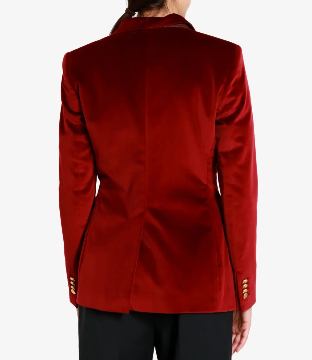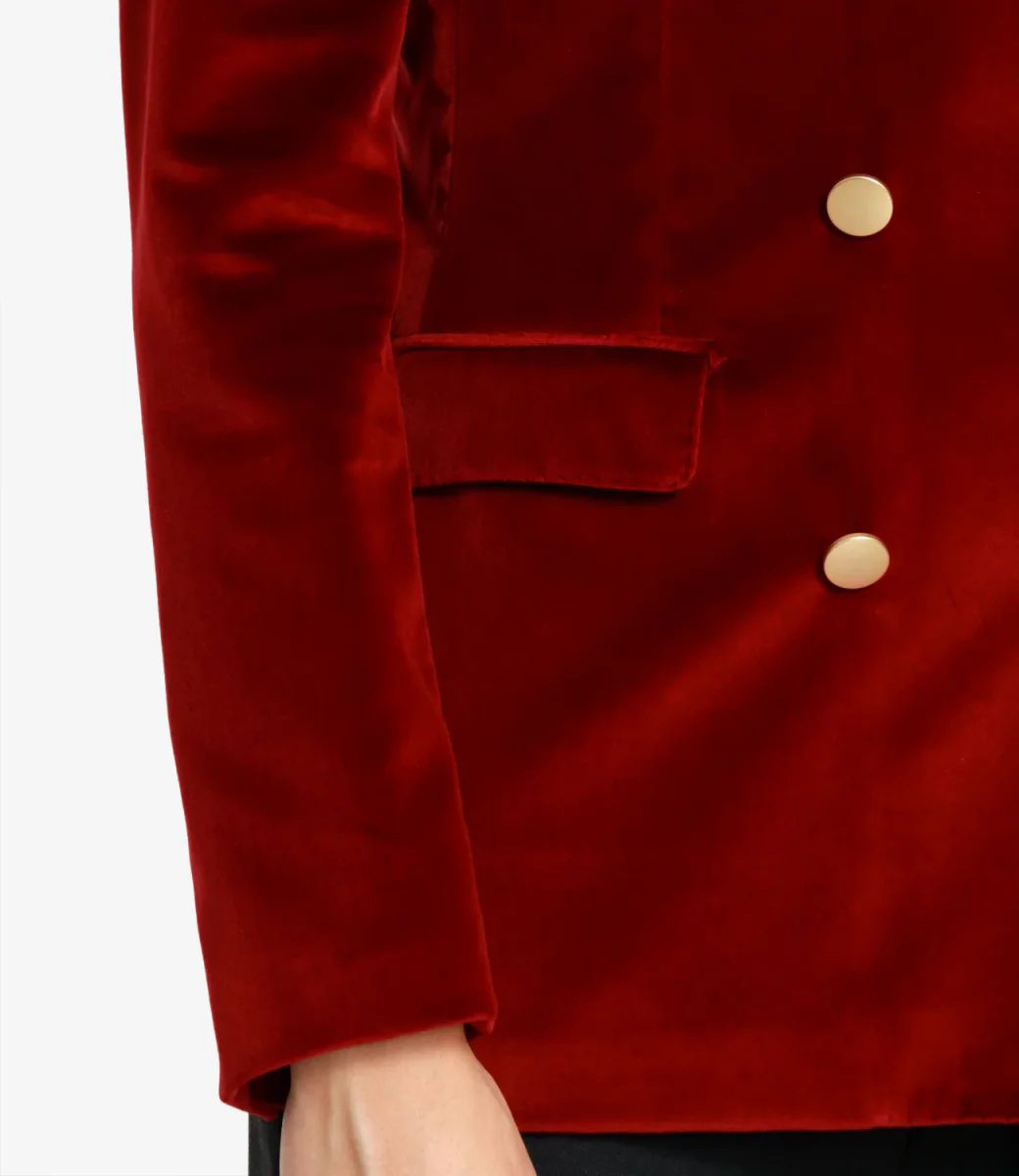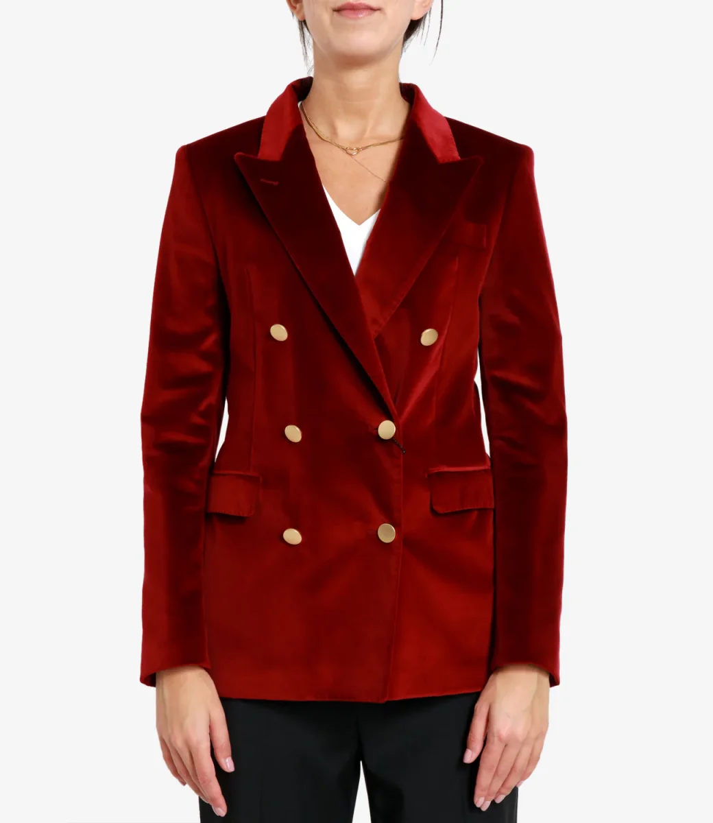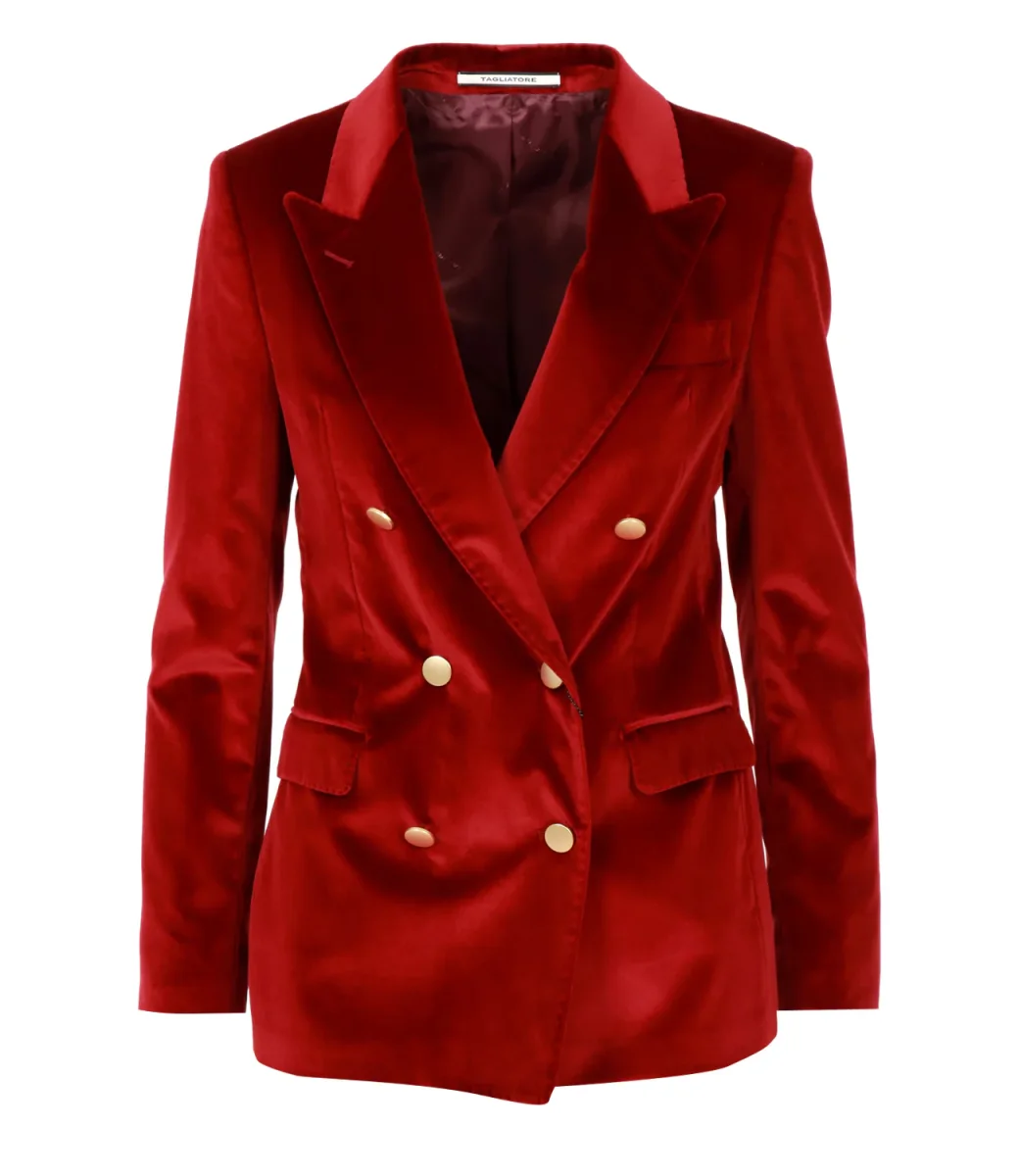 Giacca Tagliatore J-Parigi in velluto, revers a lancia, modello doppiopetto con bottoni dorati, taschino sul petto lato sinistro, maniche lunghe con bottoni sui polsini, tasche con patta sul davanti, spacco centrale sul retro.