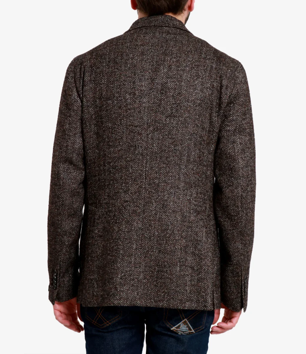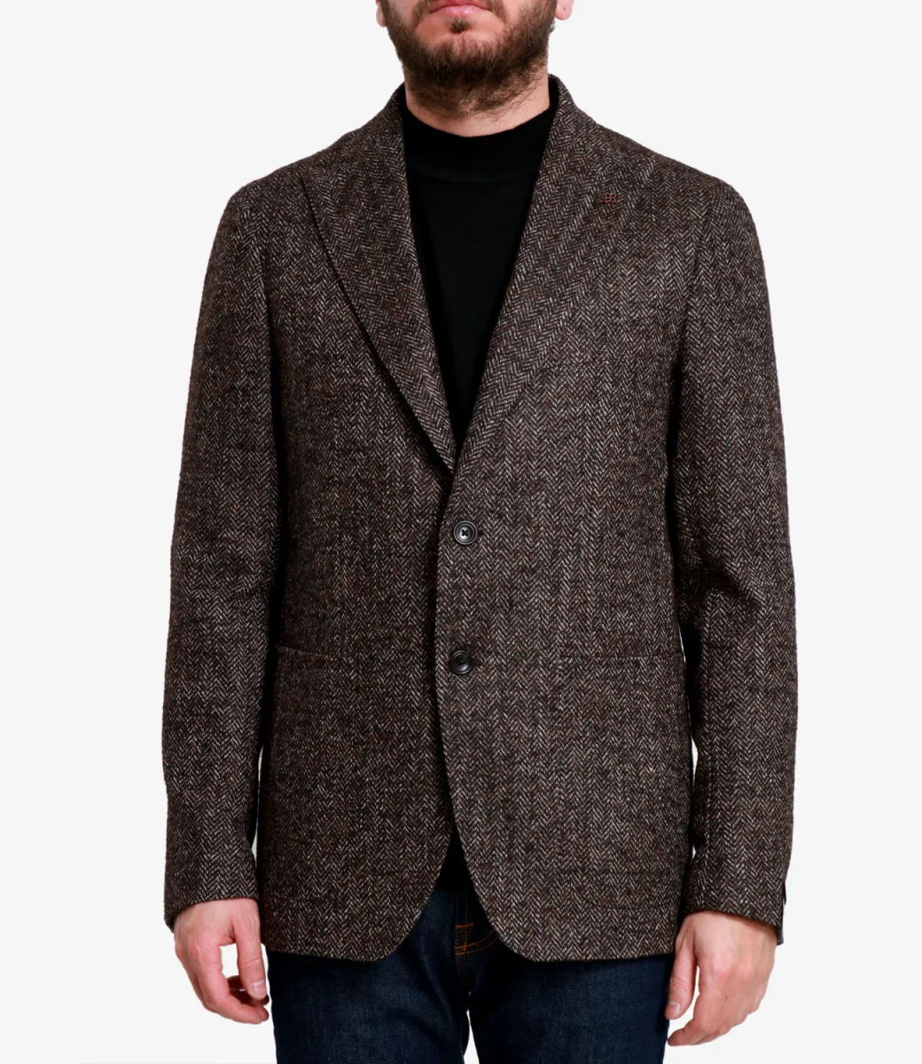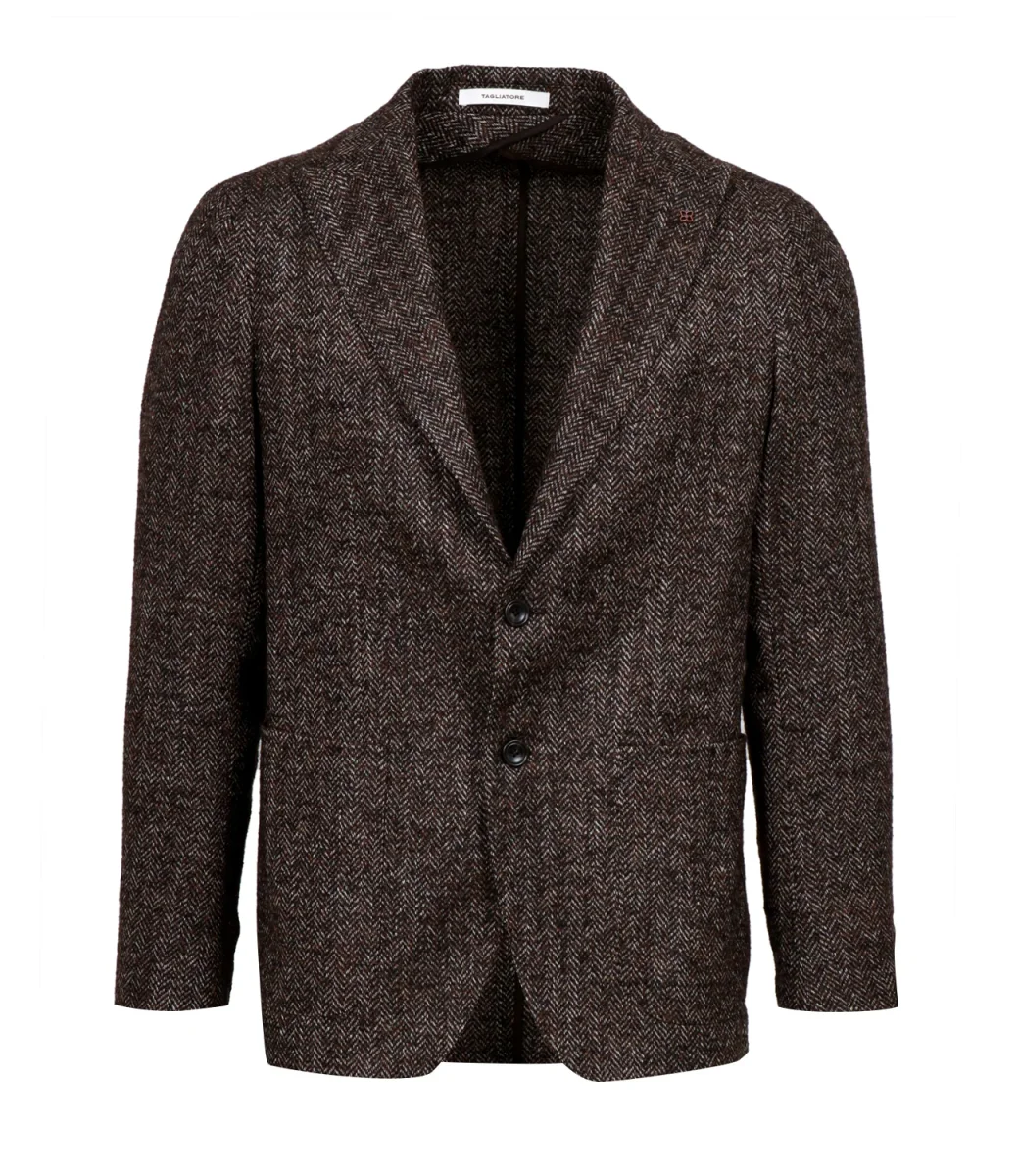Giacca Tagliatore modello monopetto, realizzato in misto lana, motivo spigato, con revers a lancia con dettaglio charm logo in metallo nell’asola sul lato sinistro, taschino petto lato sinistro, maniche lunghe con spacchi e bottoni sul polsino, chiusura a due bottoni, spacchi sul retro, due tasche applicate a fessura, dettaglio etichetta logo, orlo dritto.