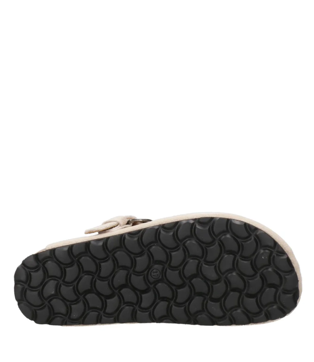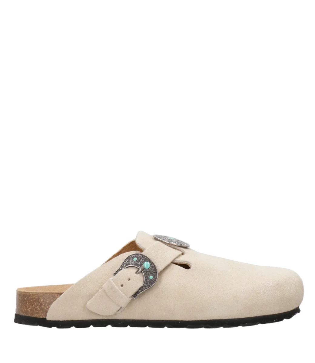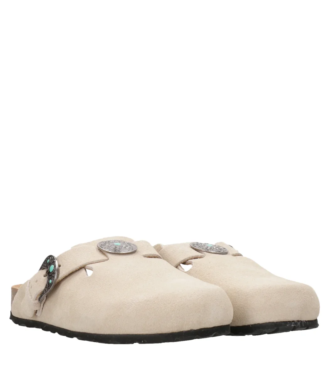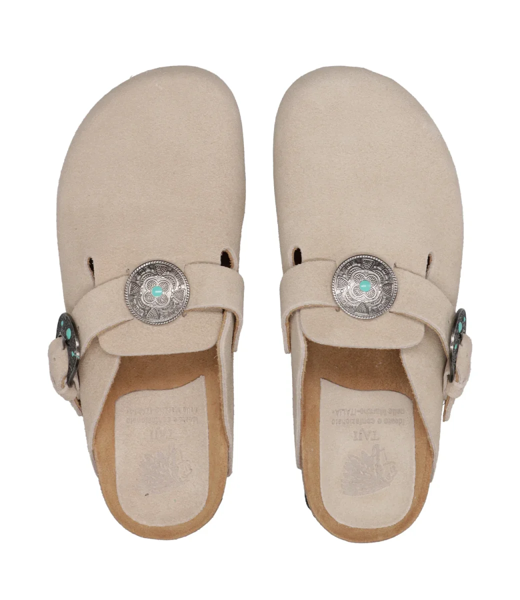 Sabot Taji 140 realizzato in pelle di vitello scamosciato imprezziosito con dettagli in metallo argentato e pietre color turchese. Fascia regolabile con fibbia sulla tomaia.
