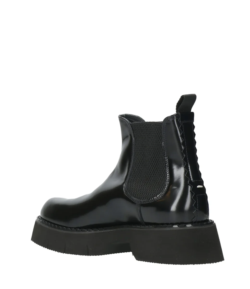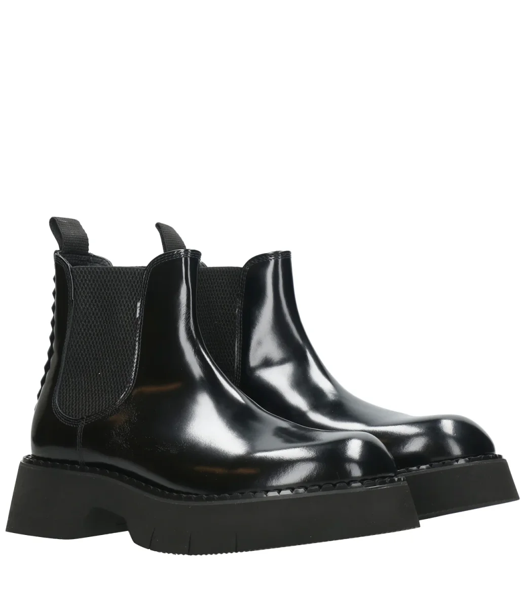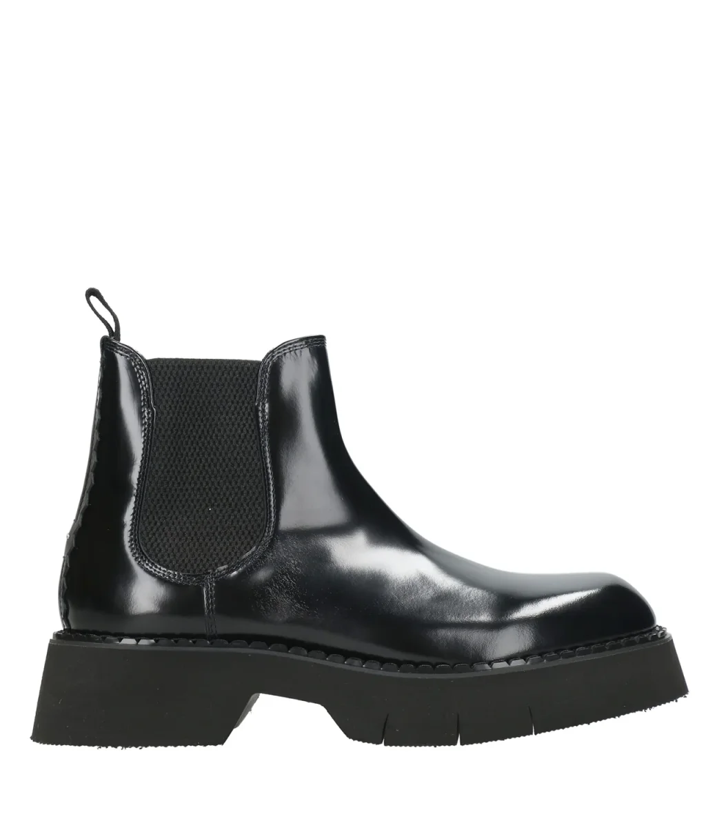 Stivaletto in elegante pelle lucida con inserti elastici laterali, monogramma impresso e suola in gomma con gommini a rilievo.