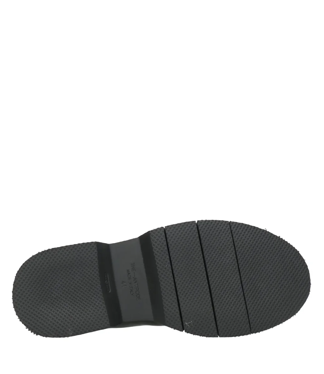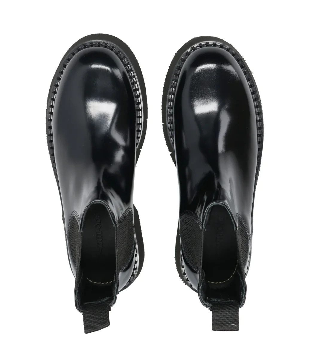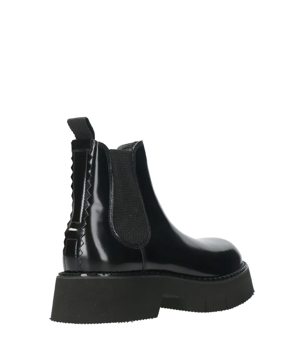 Stivaletto in elegante pelle lucida con inserti elastici laterali, monogramma impresso e suola in gomma con gommini a rilievo.