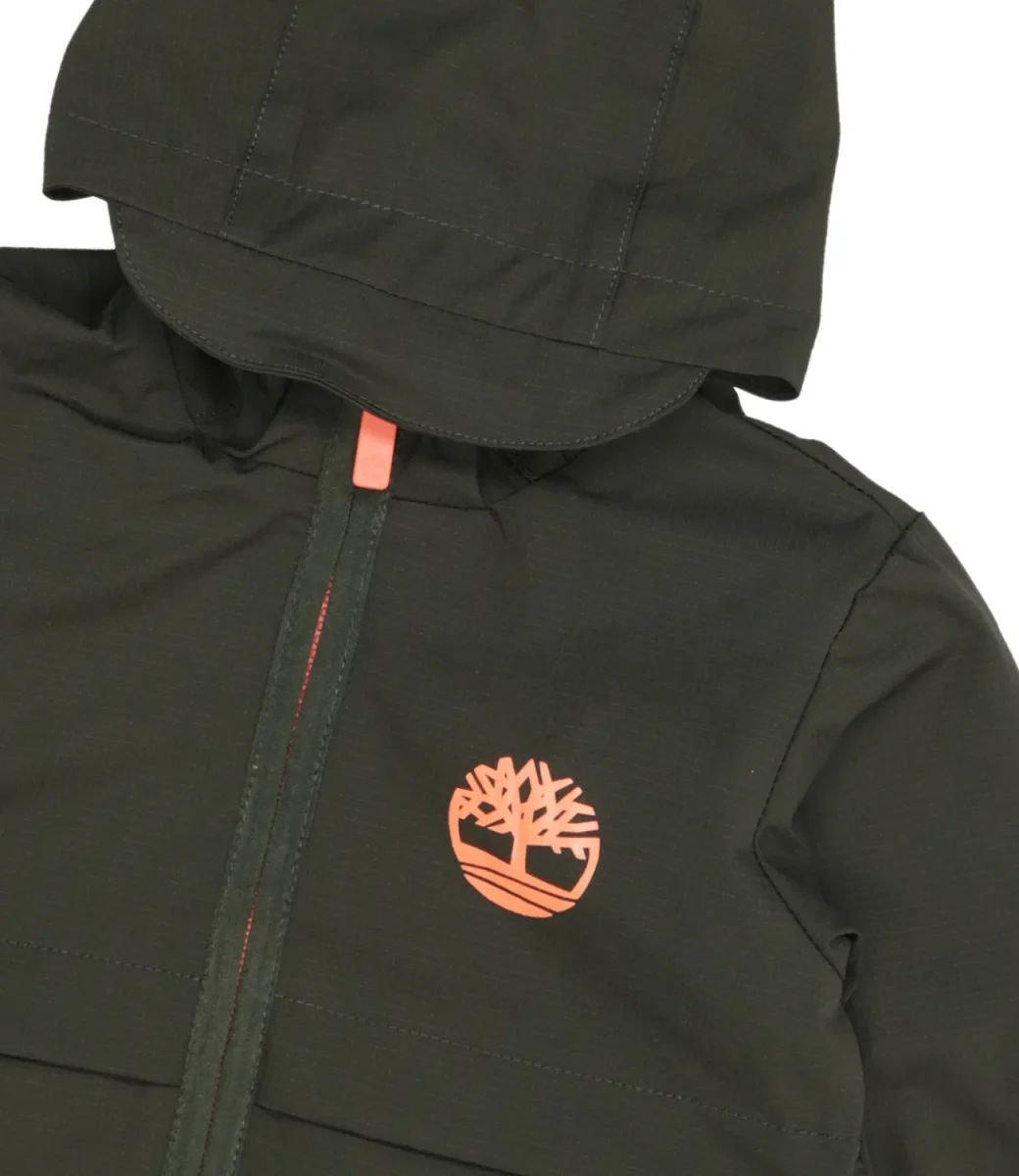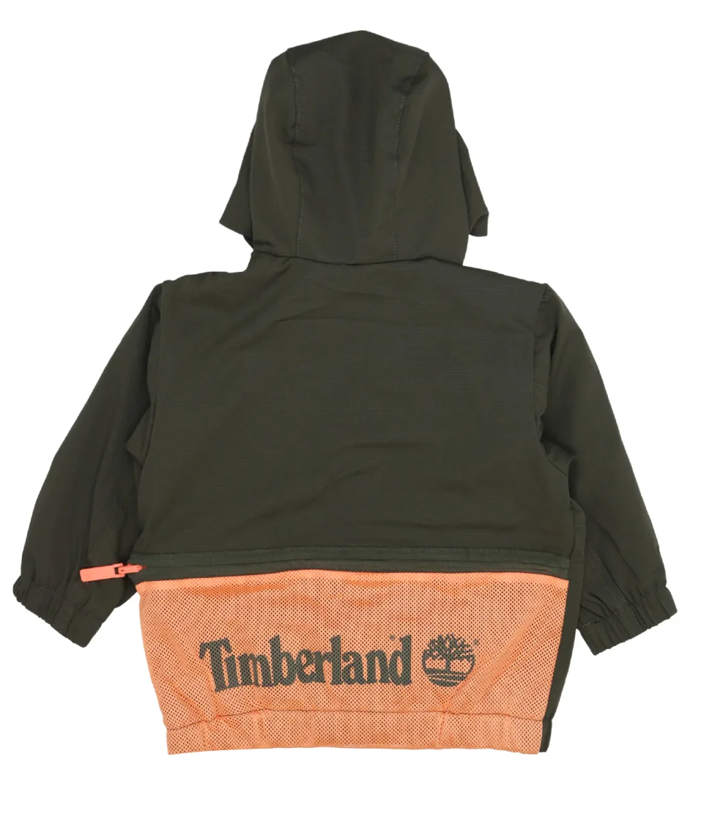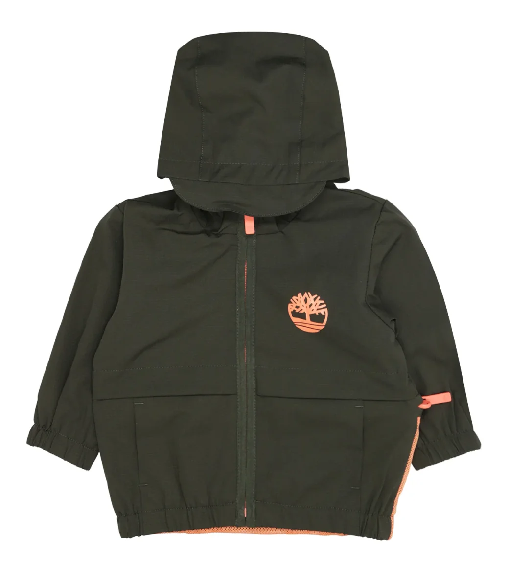 Giubbotto Timberland Kids in tessuto tecnico antivento. Cappuccio con retina interna per rendere facile la traspirabilità. Chiusura con zip, logo stampato sul petto laterale sinistro.