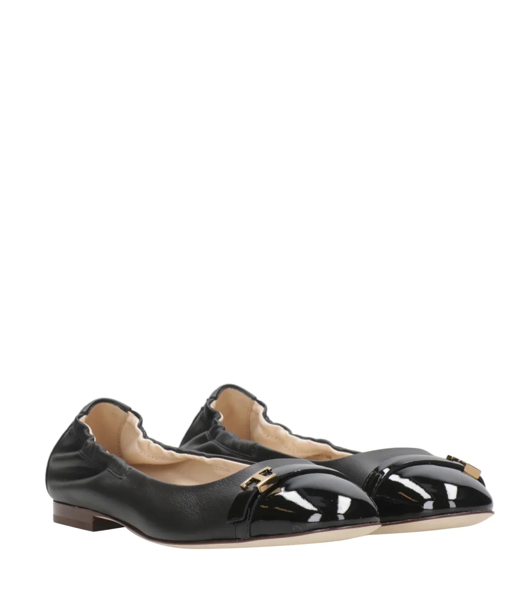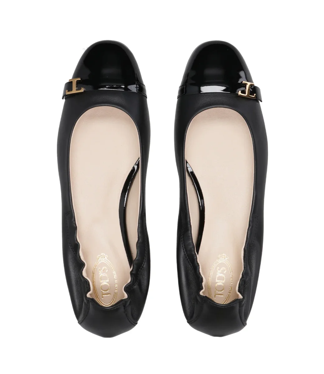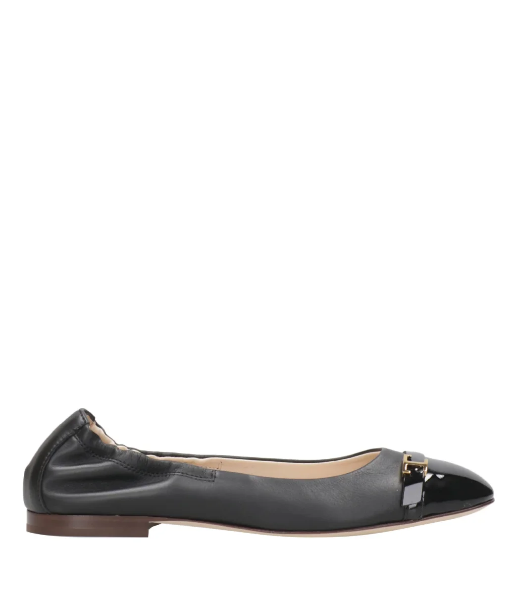 Ballerina Tod’s in pelle di vitello con punta in vernice e mini accessorio T Timeless in metallo. Dotata di una suola in cuoio e di un bordo superiore sul retro tallone con inserto elastico, modello raffinato che combina confort e femminilità.