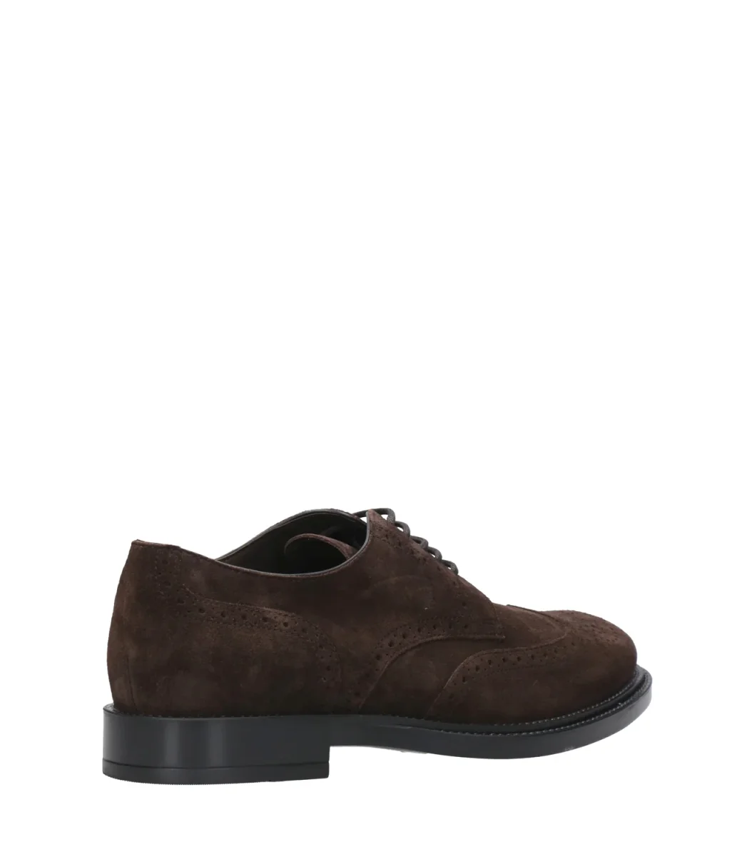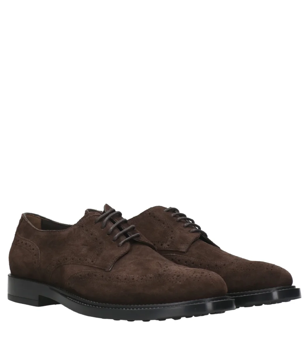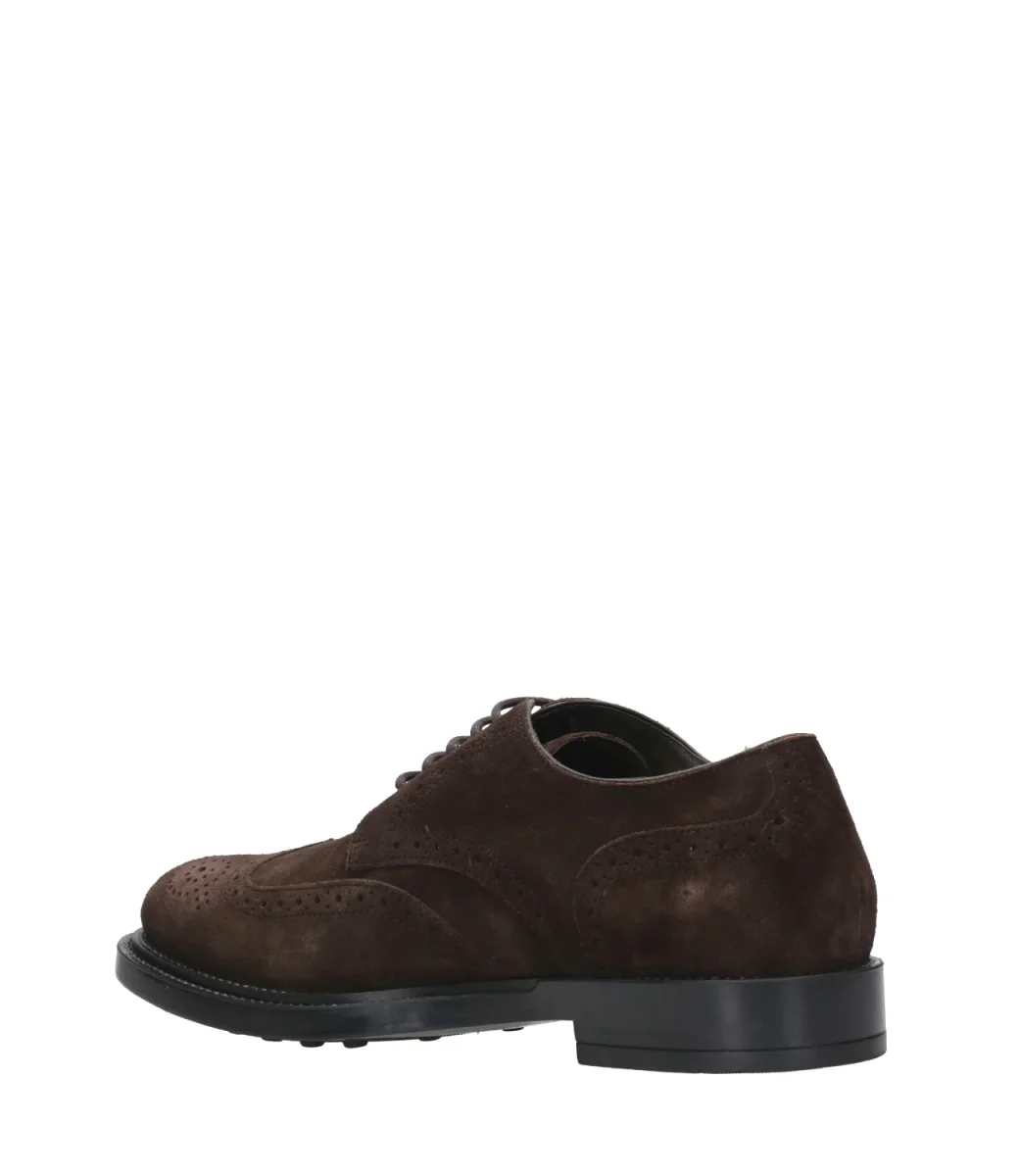 Derby stringata Tod’s in vellutata pelle scamosciata con bucature all’inglese a coda di rondine, monogramma impresso e suola in gomma con gommini a rilievo.
