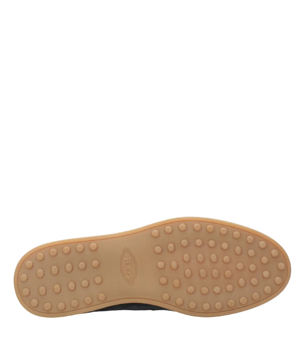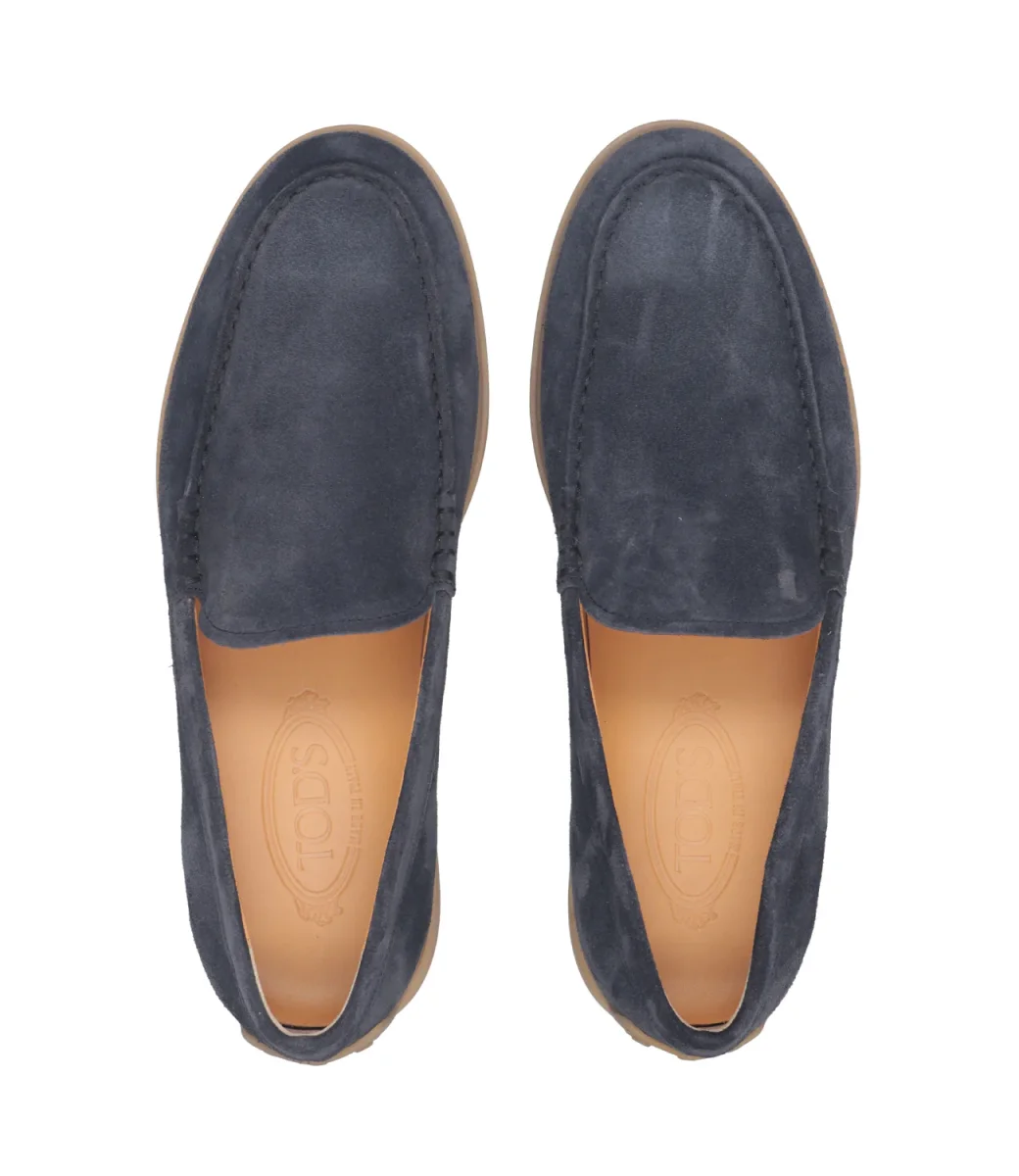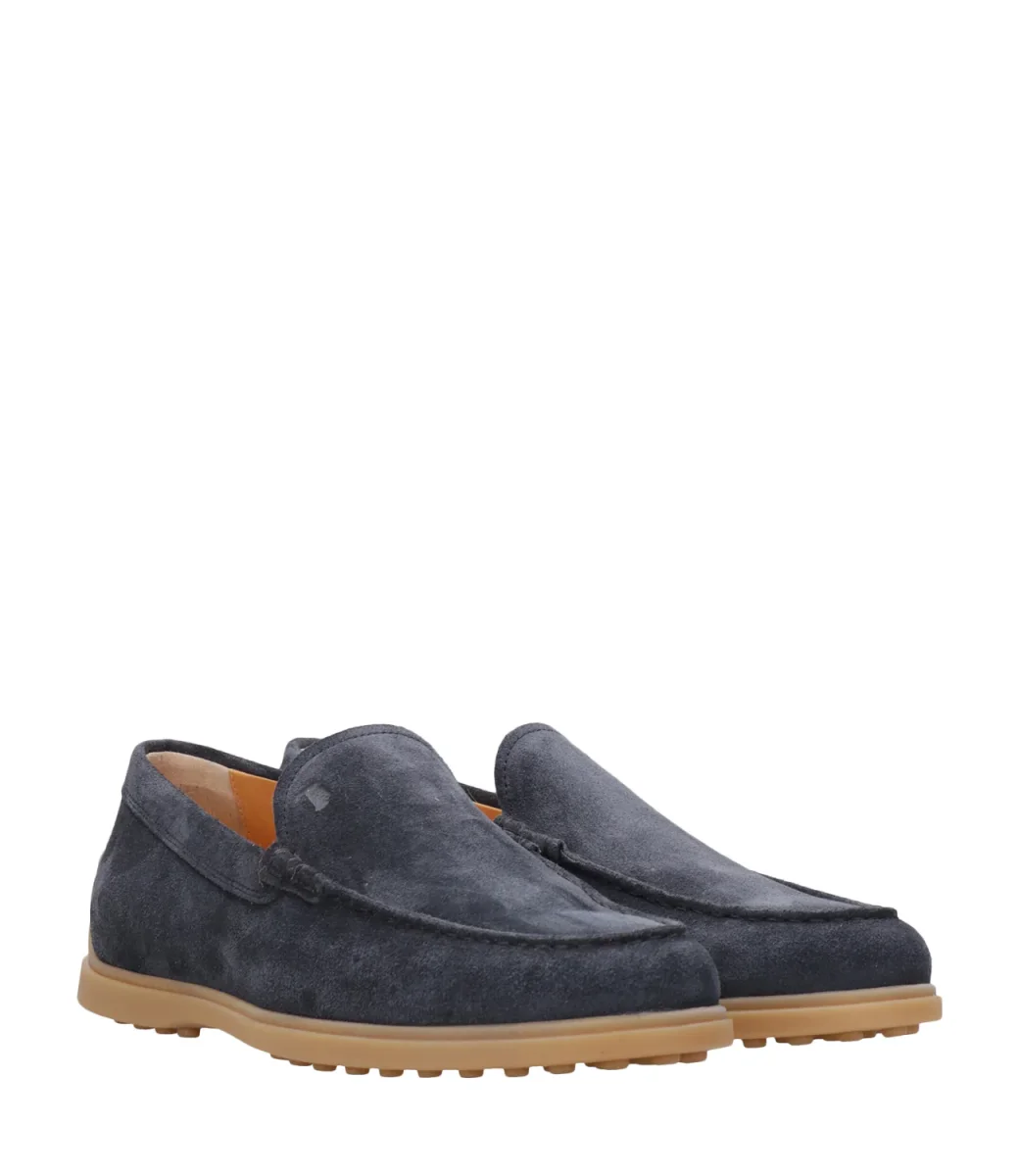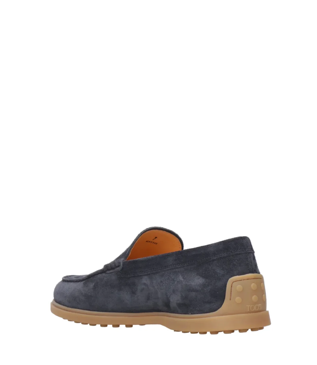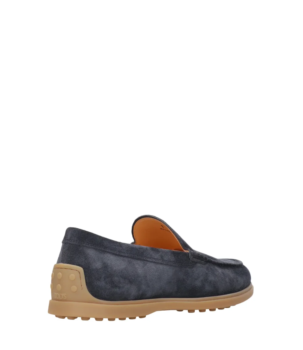 Mocassino Tod’s realizzata in pelle di vitello scamosciata. Modello in versione pantofola con tomaia liscia e monogramma Tod’s impresso, iconici gommini in rilievo sul tallone e una suola in gomma.