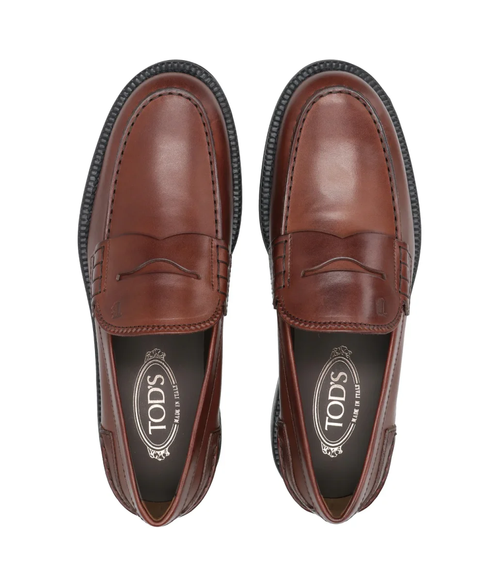 Mocassino Tod’s in elegante pelle semilucida nera con mascherina, monogramma Tod’s impresso e suola in cuoio.