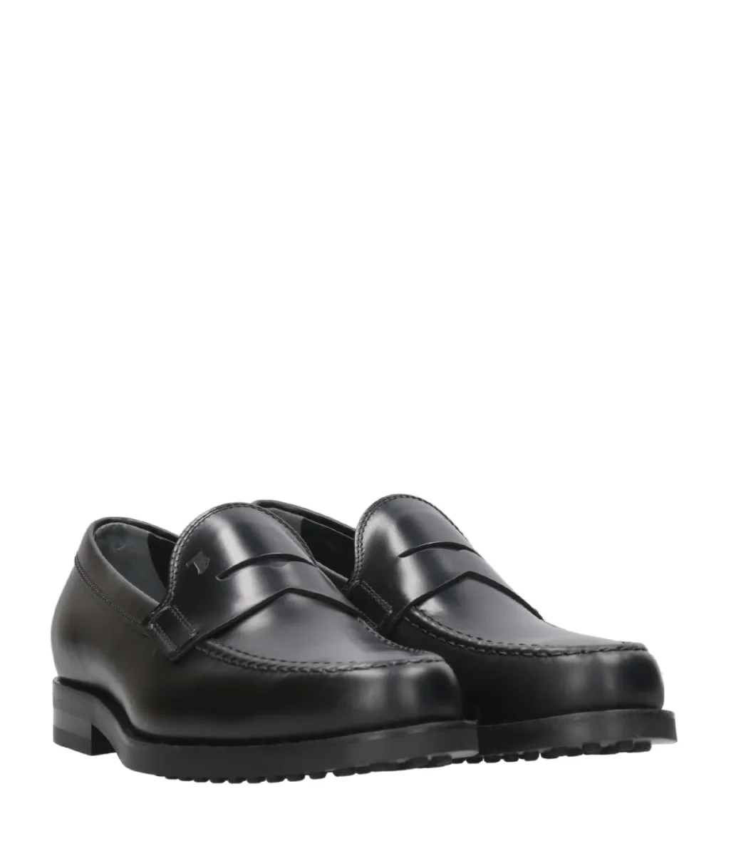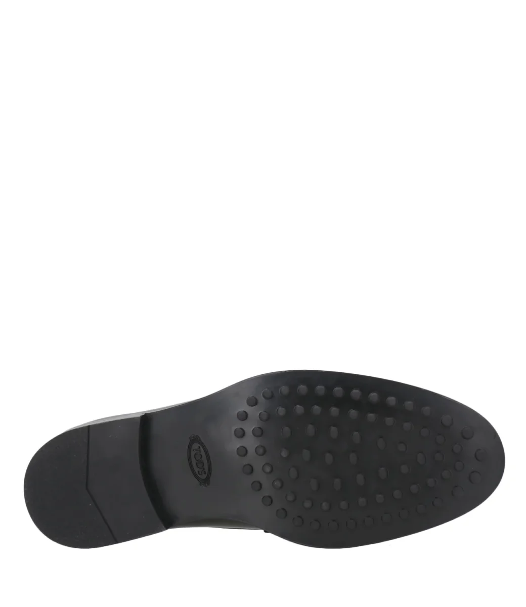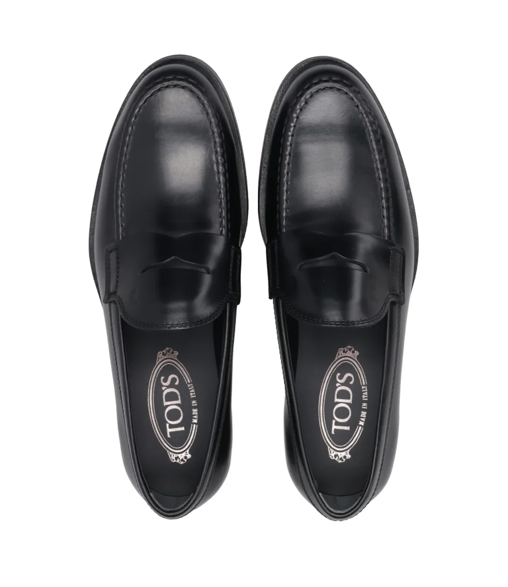 Mocassino Tod’s modello Formal Gomma ZF in pelle semilucida con monogramma Tod’s impresso, suola in gomma e gommini in rilievo.