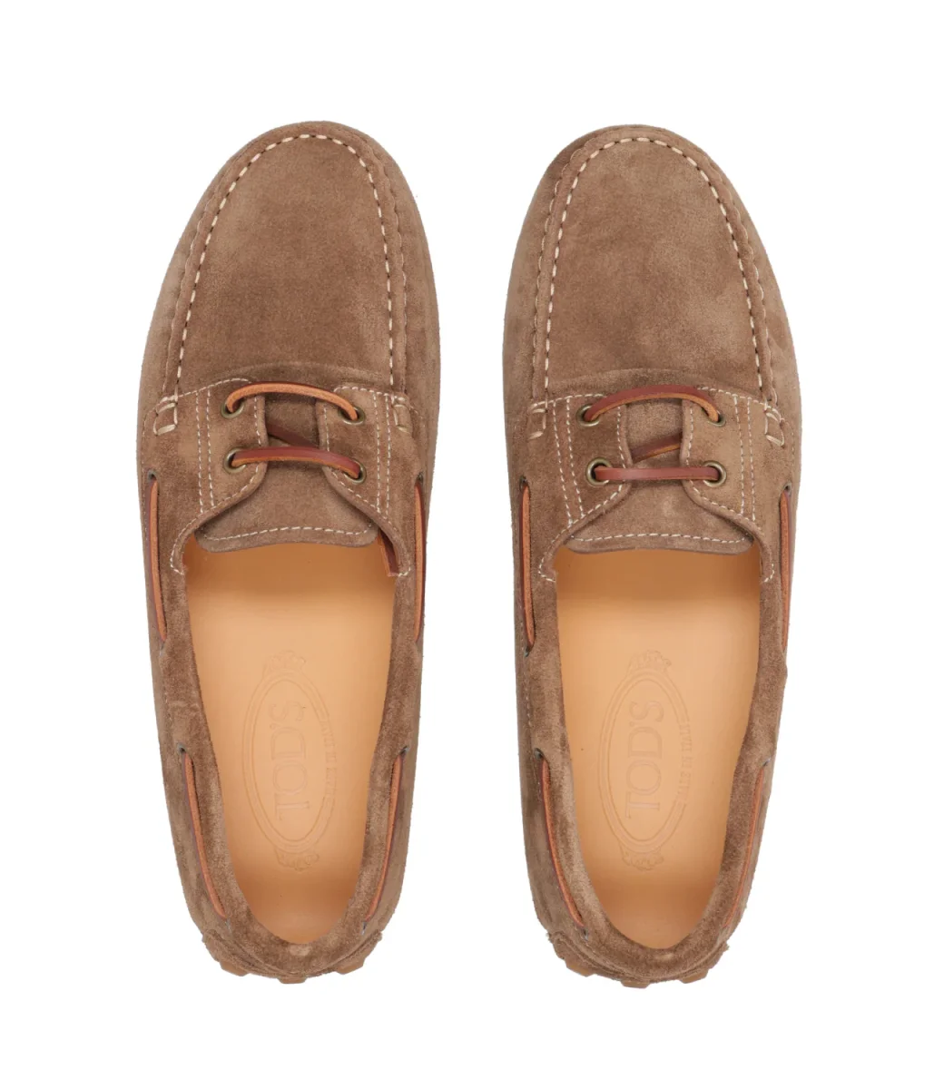 Mocassino Tod’s realizzato in pelle di vitello scamosciata con lavorazione artigianale, chiusura con stringhe, iconici gommini sulla suola e sul tallone.