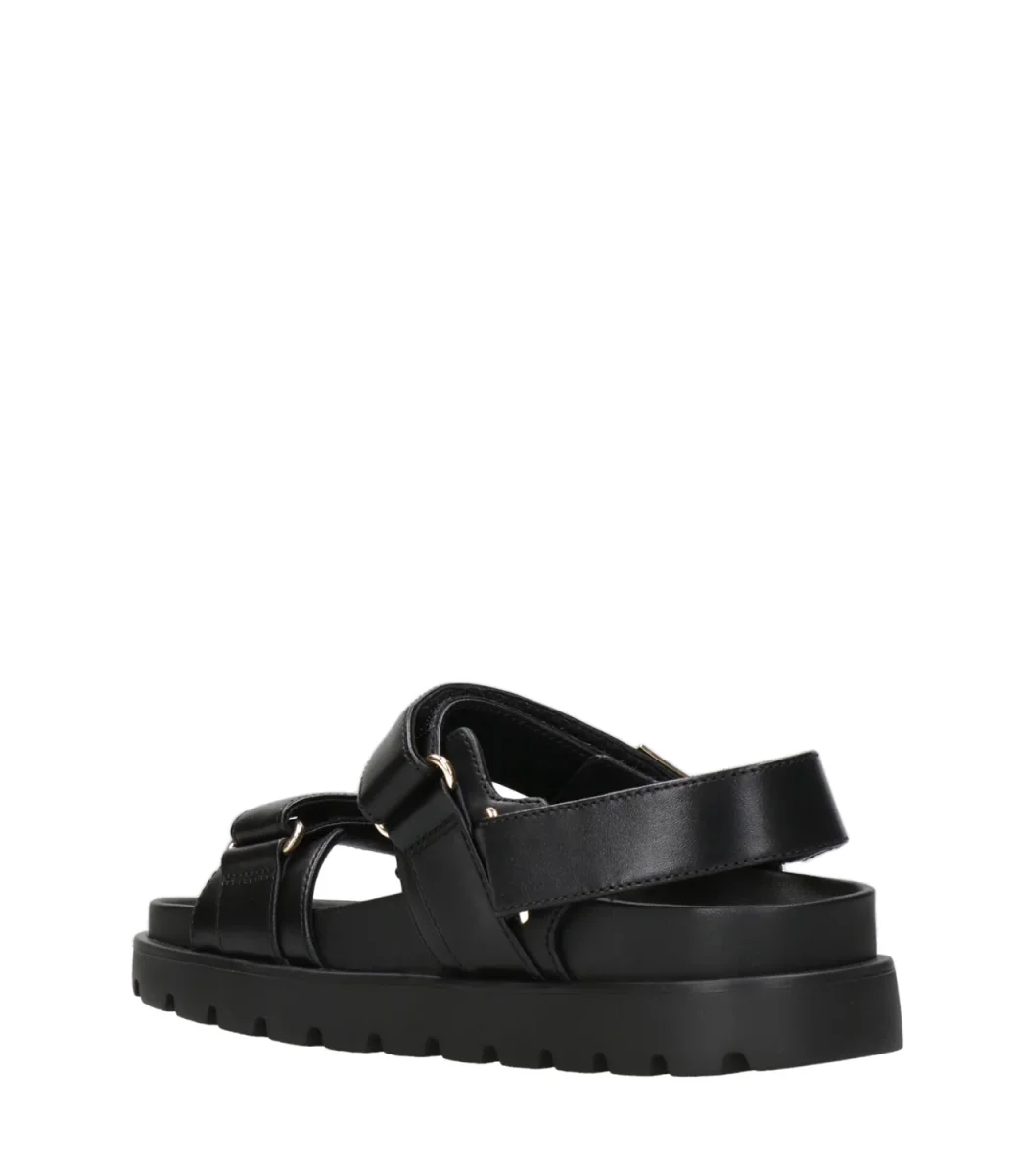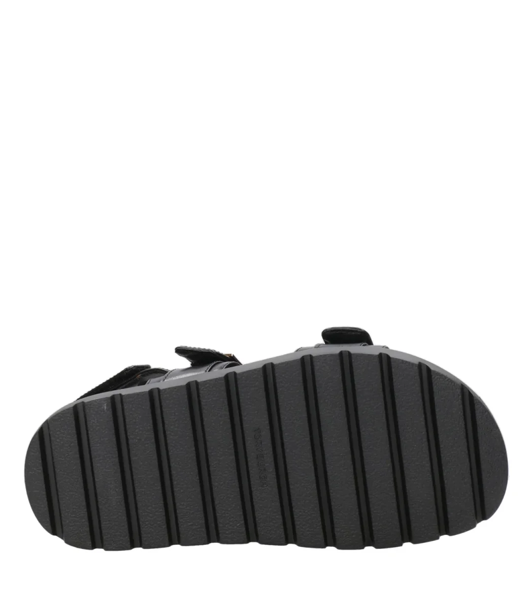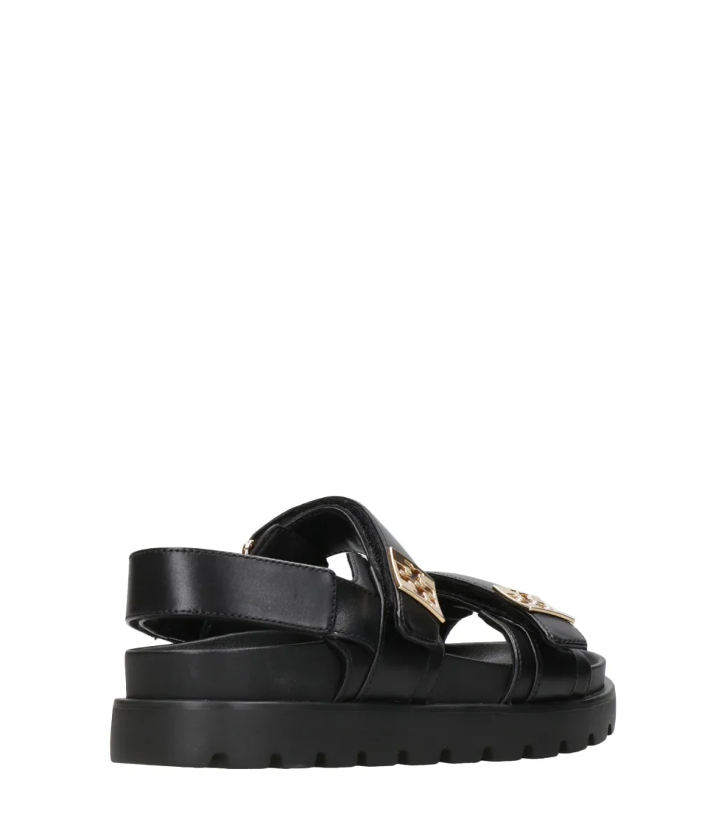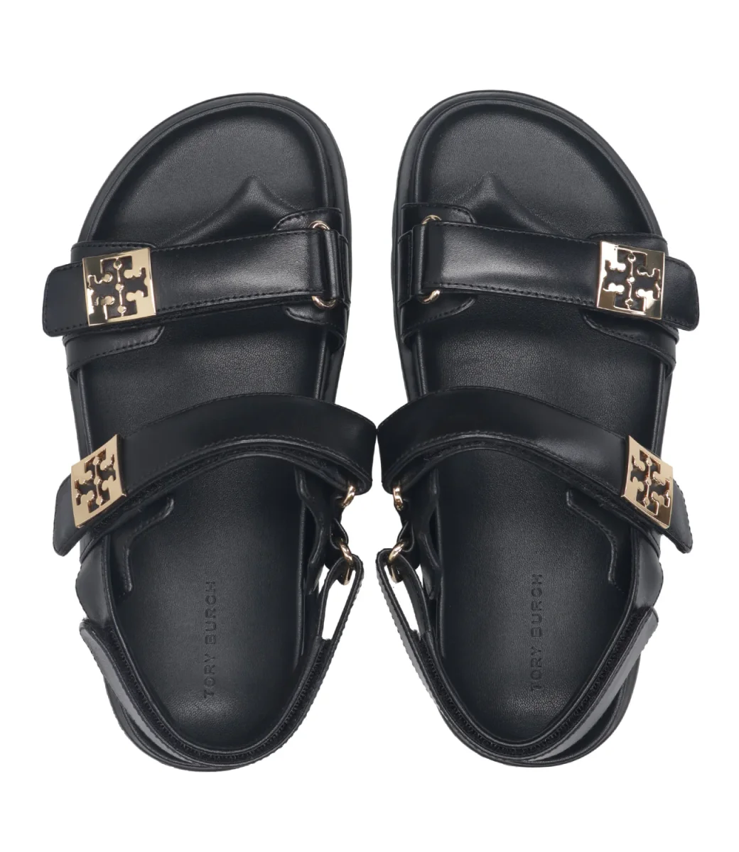 Sandalo Tory Burch Mellow realizzato in morbida pelle. Modello con doppia fascia regolabile con logo in placca di metallo con doppia T rovesciata e sul retro della caviglia. Pratico e comodo con soletta modellata in pelle e suola a carrarmato in gomma, adatto per ogni momento della giornata.