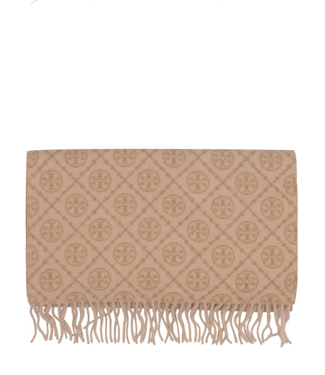 Sciarpa Tory Burch T Monogram in lana e cashmere, accessorio di stile nelle giornate più fredde.