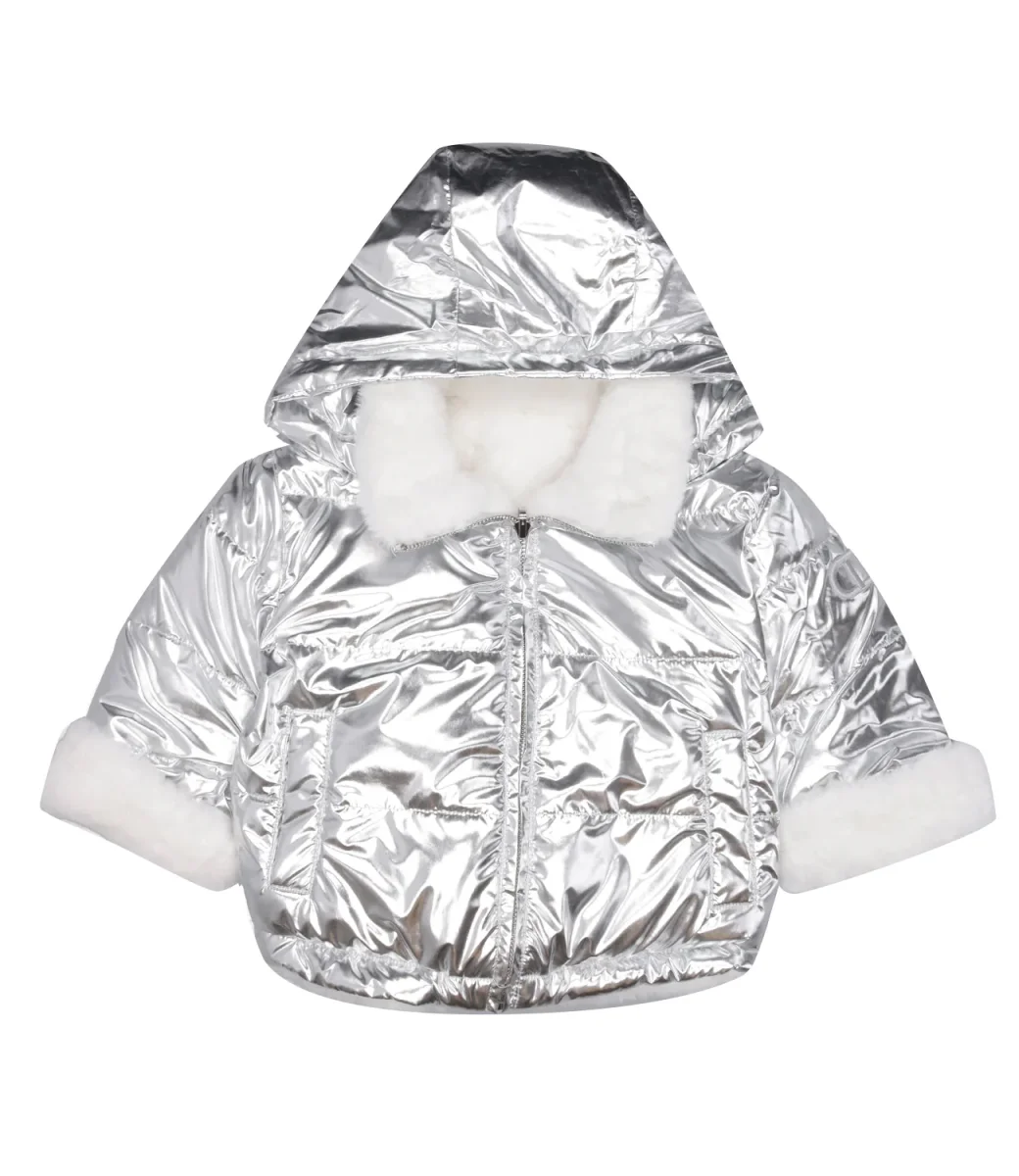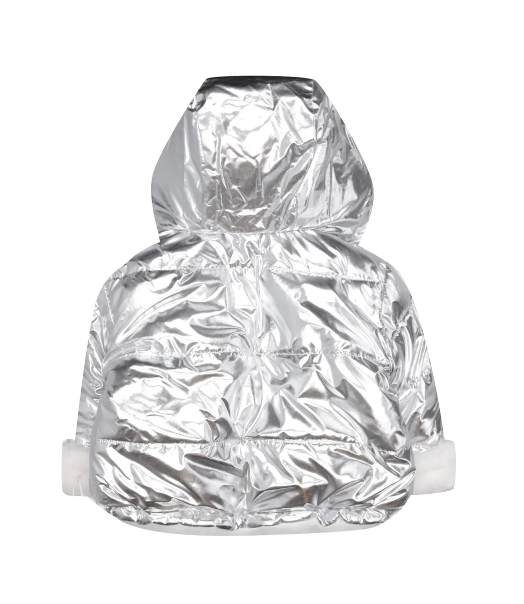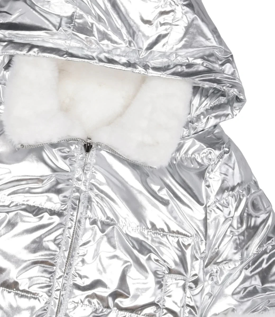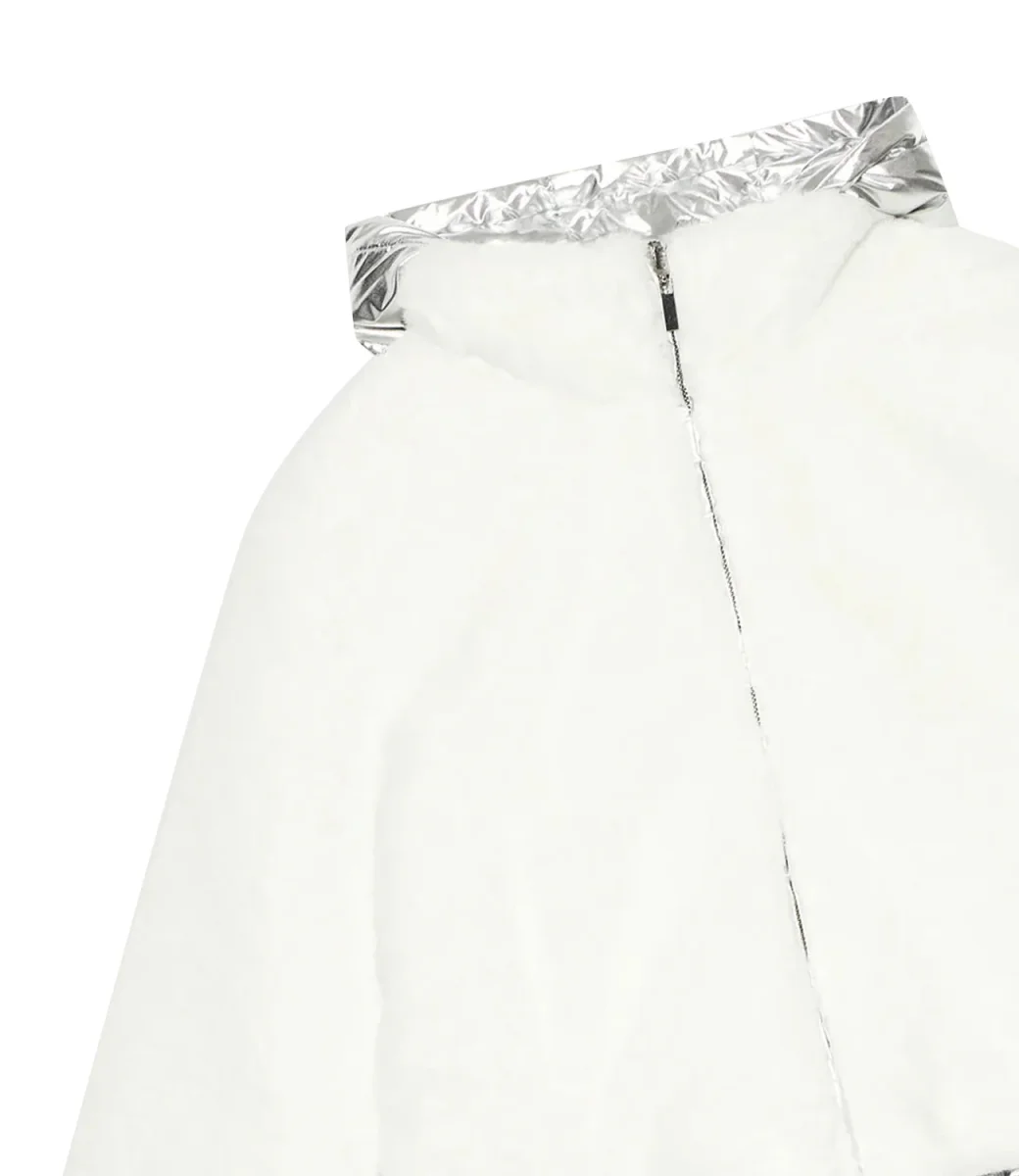 Giubbotto Twinset modello reversibile in tessuto tecnico argentato con motivo trapuntato da un lato ed in tessuto faux fur effetto pelliccia dall’altro, con colletto a punta, cappuccio rimovibile, chiusura con zip in metallo, tasche a filetto sul davanti, logo Oval T sulla manica, linea morbida regolabile al fondo con coulisse, vestibilità regolare.