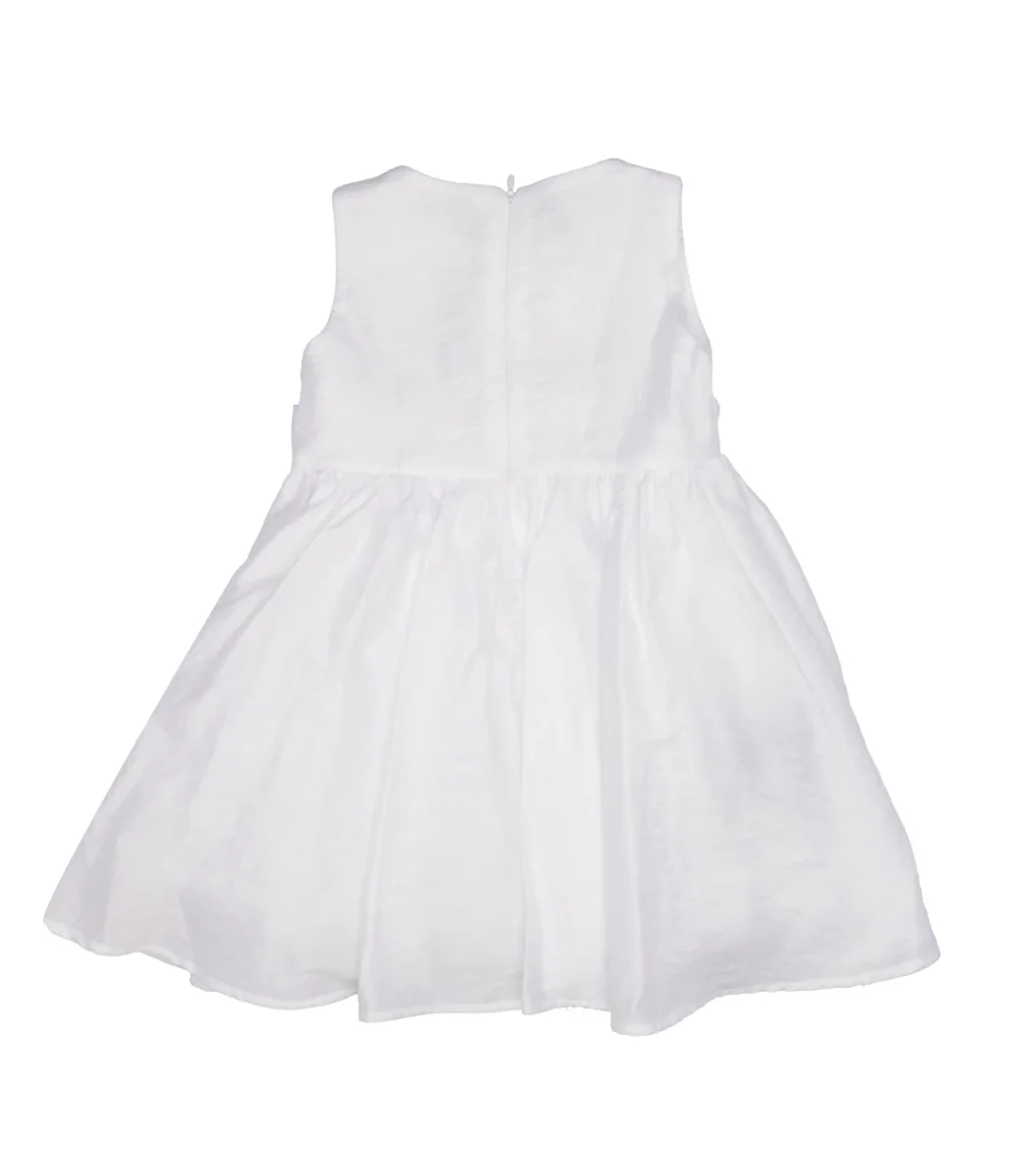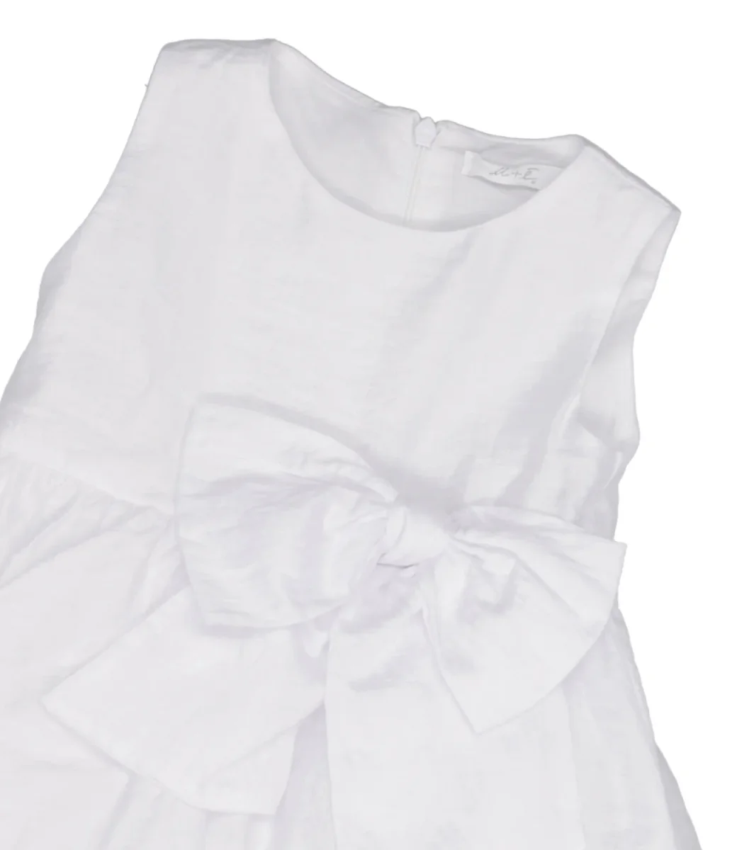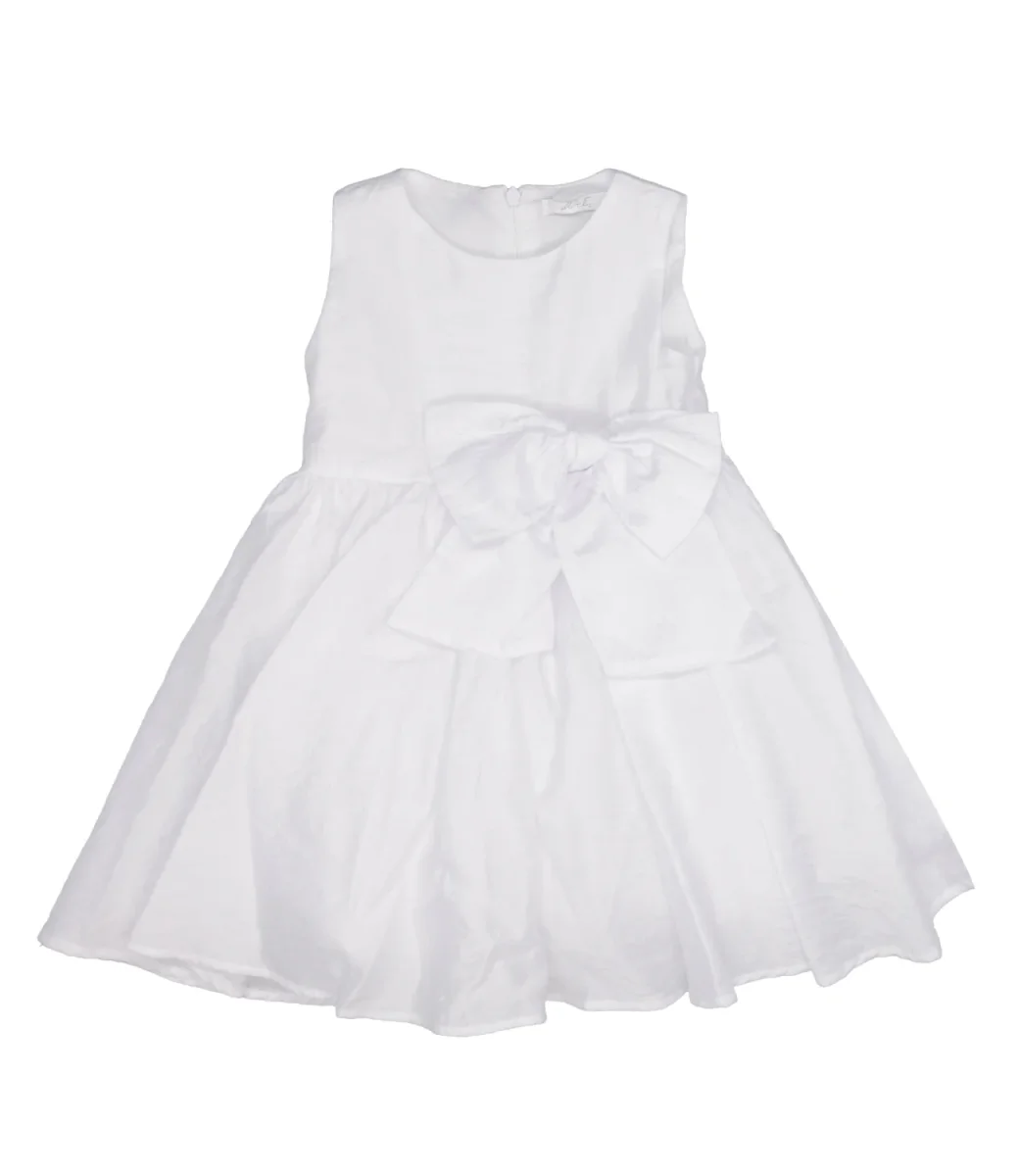 Abito U+é By Miss Grant in tessuto creato dalla lavorazione di filati sottilissimi che ne rendono unica la trama dal finish leggero e semi lucido, modello con scollo rotondo, spalle a canotta, vita sottolineata con un grande fiocco sul davanti, gonna svasata