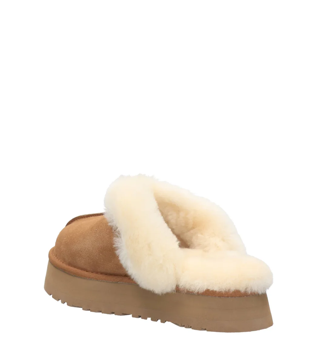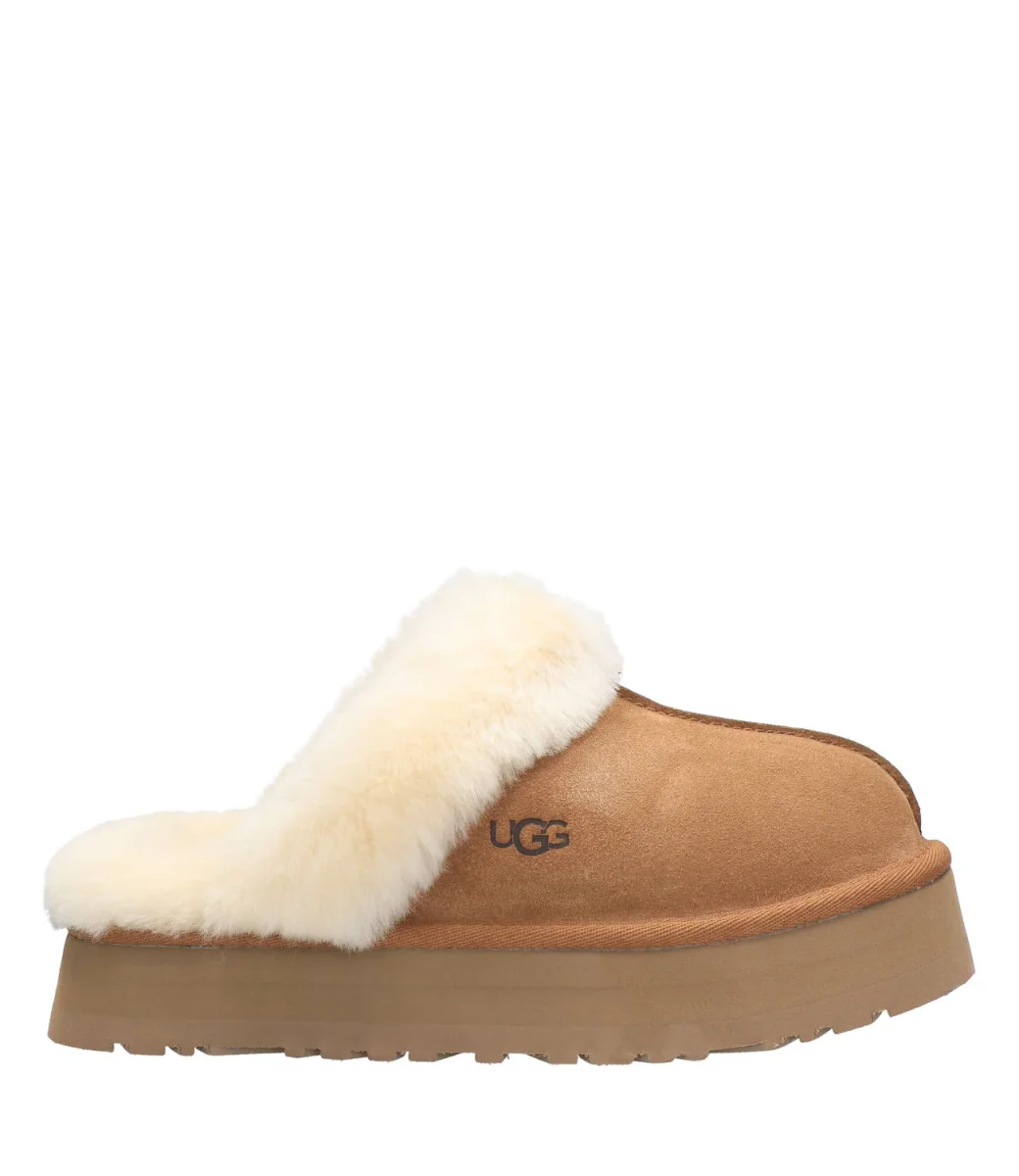 Sabot UGG Disquette design sil on con platform. Realizzato in pelle scamosciata e foderato in soffice montone, Prodotto realizzato presso uno stabilimento che supporta le donne nel nostro processo di produzione e distribuzione con l’aiuto dell’iniziativa HERproject. Progetto che crea collaborazioni con brand come il nostro per fornire strumenti e formazione alle donne sul luogo di lavoro.