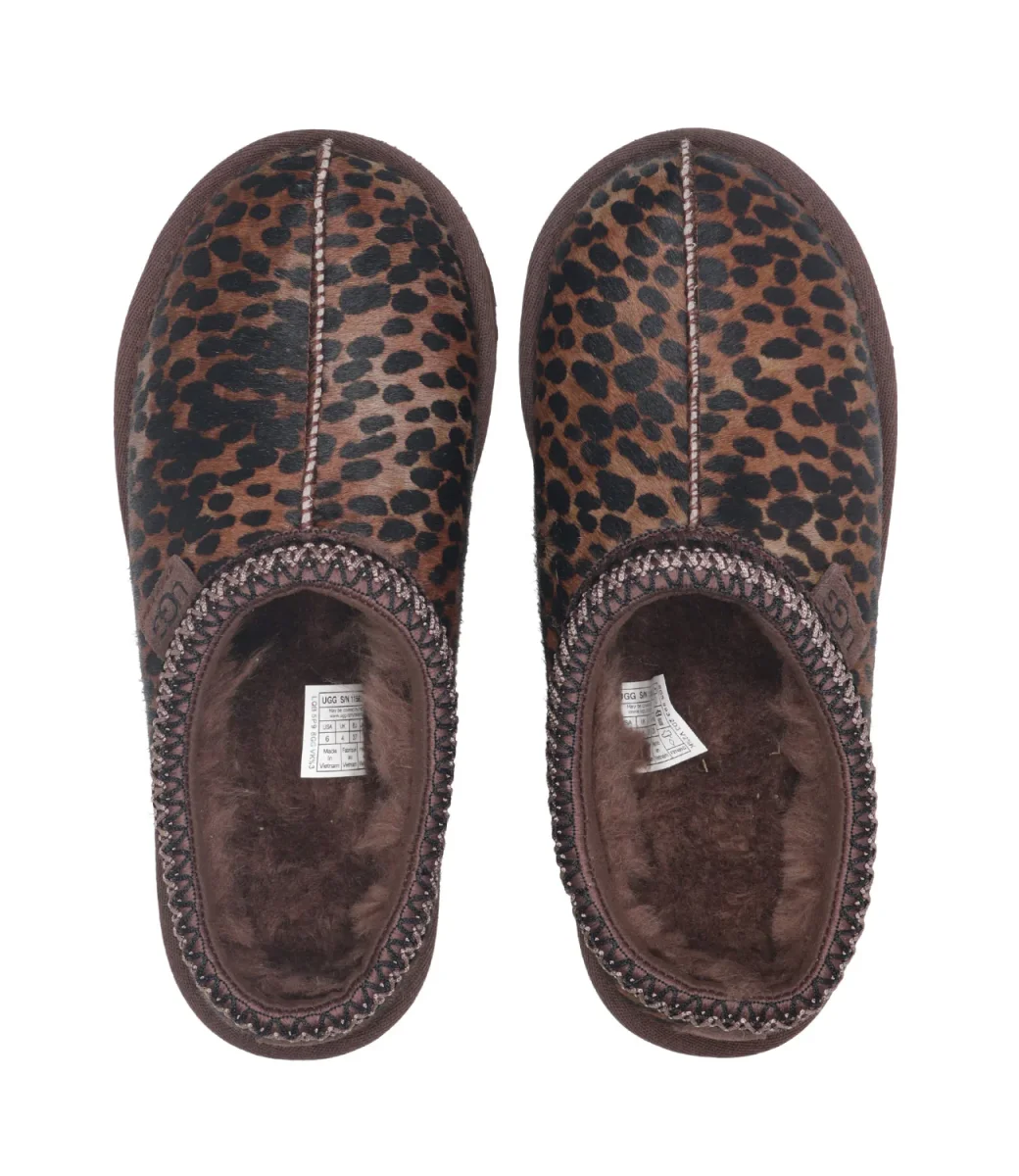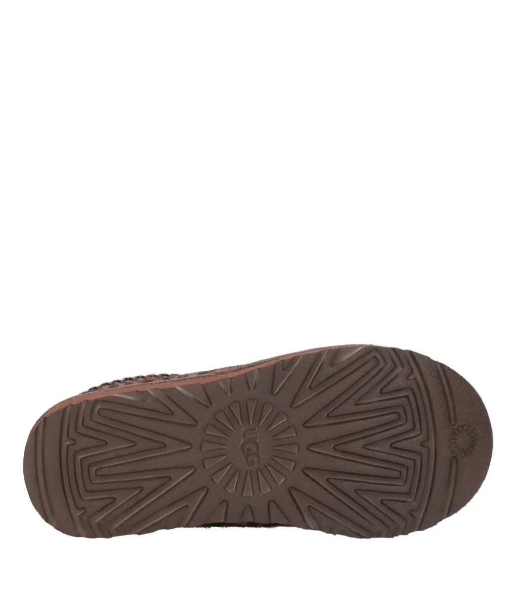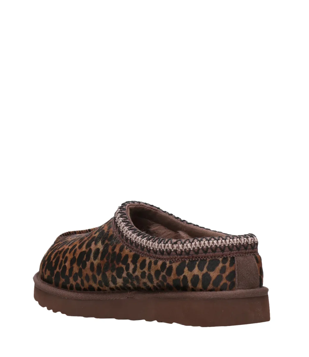 Sabot UGG Tasman modello in cavallino con stampa animalier slip on foderato in morbida lana rigenerato, realizzato in soffice pelle scamosciata con bordo decorato con intreccio ricamato, suola leggera.