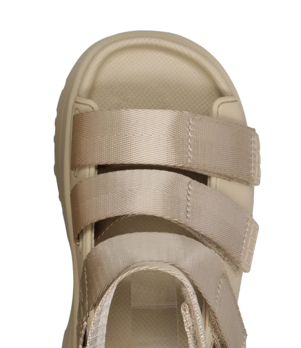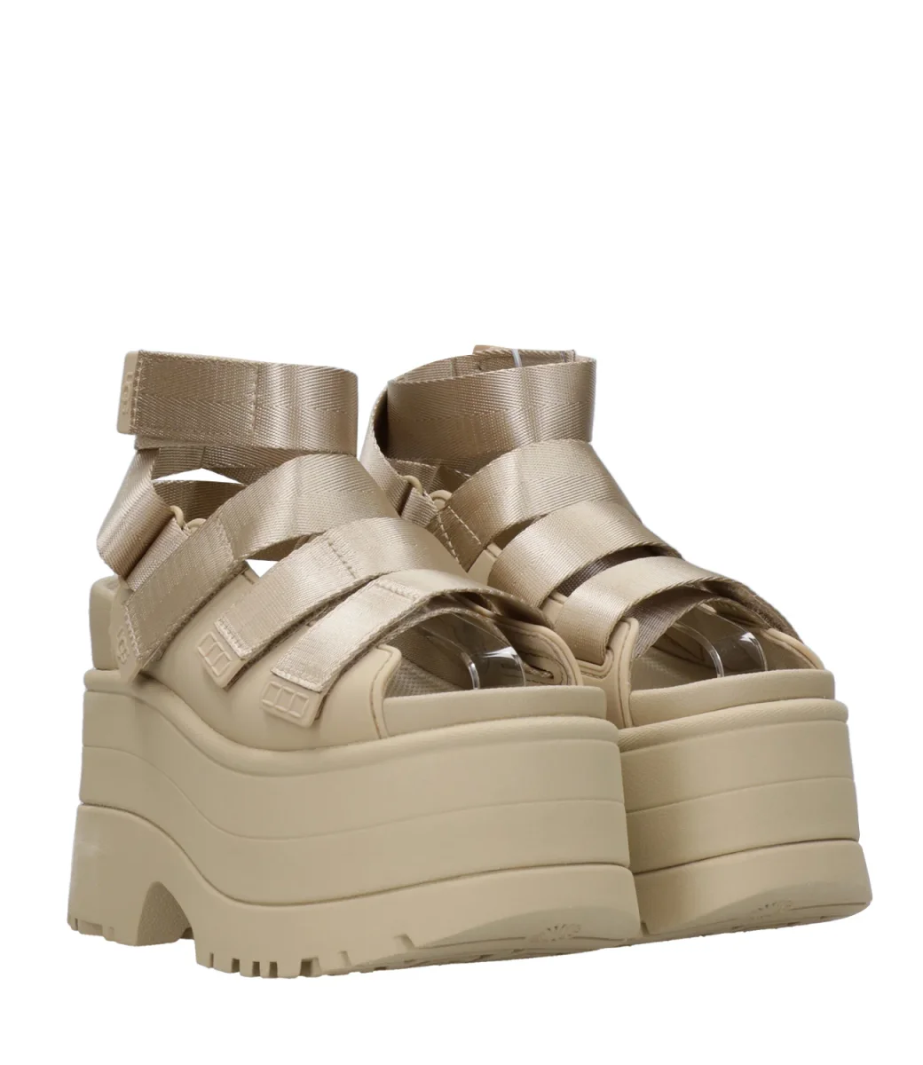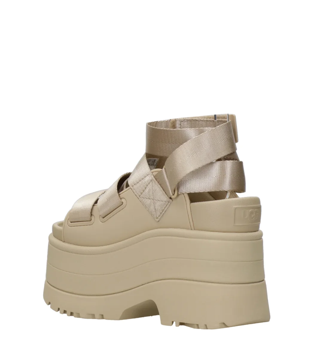 Sandalo UGG Goldenglow linea audace dal carattere estremo. Caratteristica esclusiva la leggerezza dei materiali. Plateau altissimo in EVA da canna da zucchero e la suola interna sagomata.