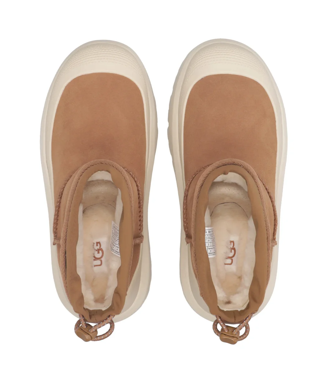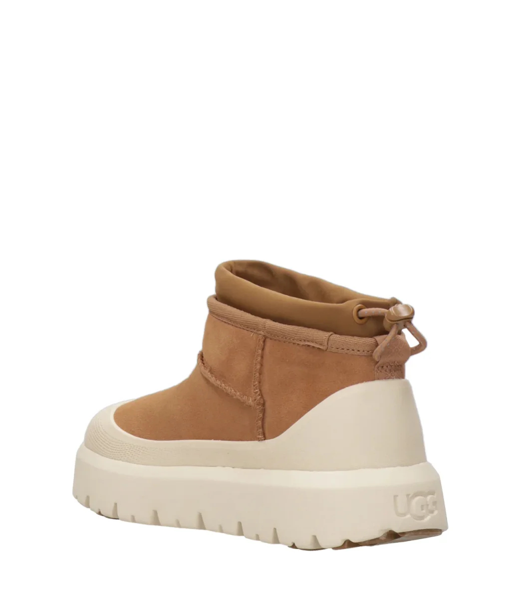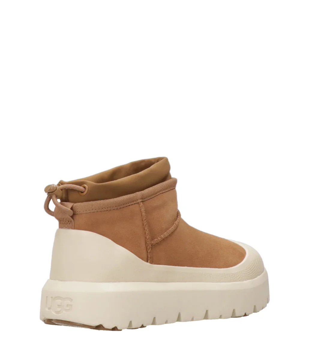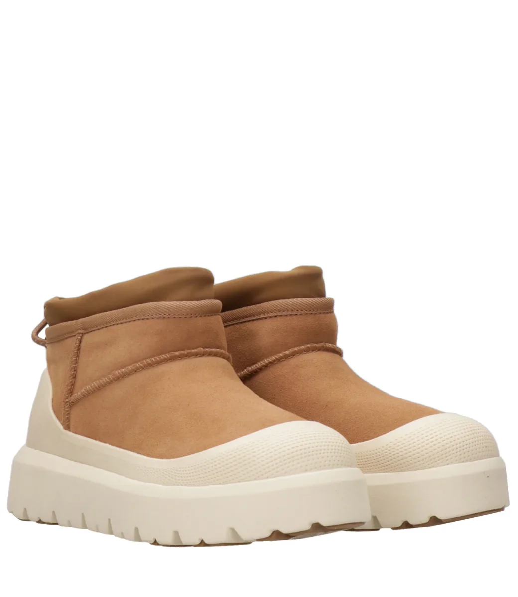 Tronchetto UGG Classic Ultra Mini Weather Hybrid in camoscio impermeabile. Modello con gambale corto, suola leggera in EVA da canna da zucchero, inserti in Spider Rubber® che offrono maggiore trazione su terreni scivolosi.