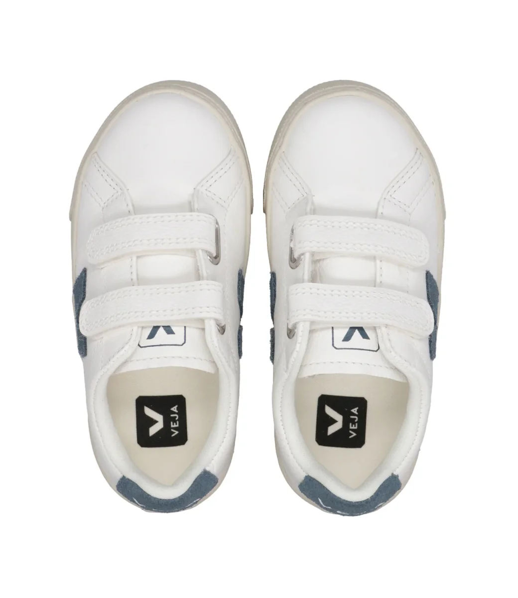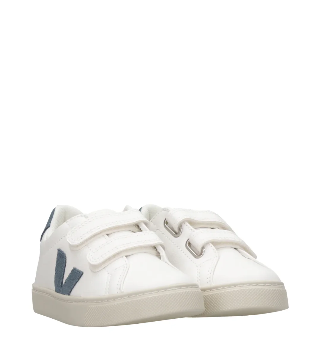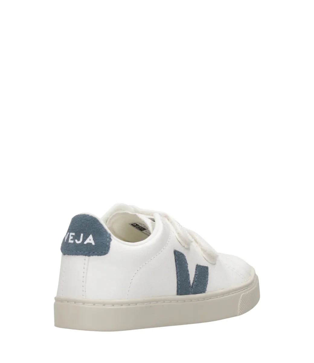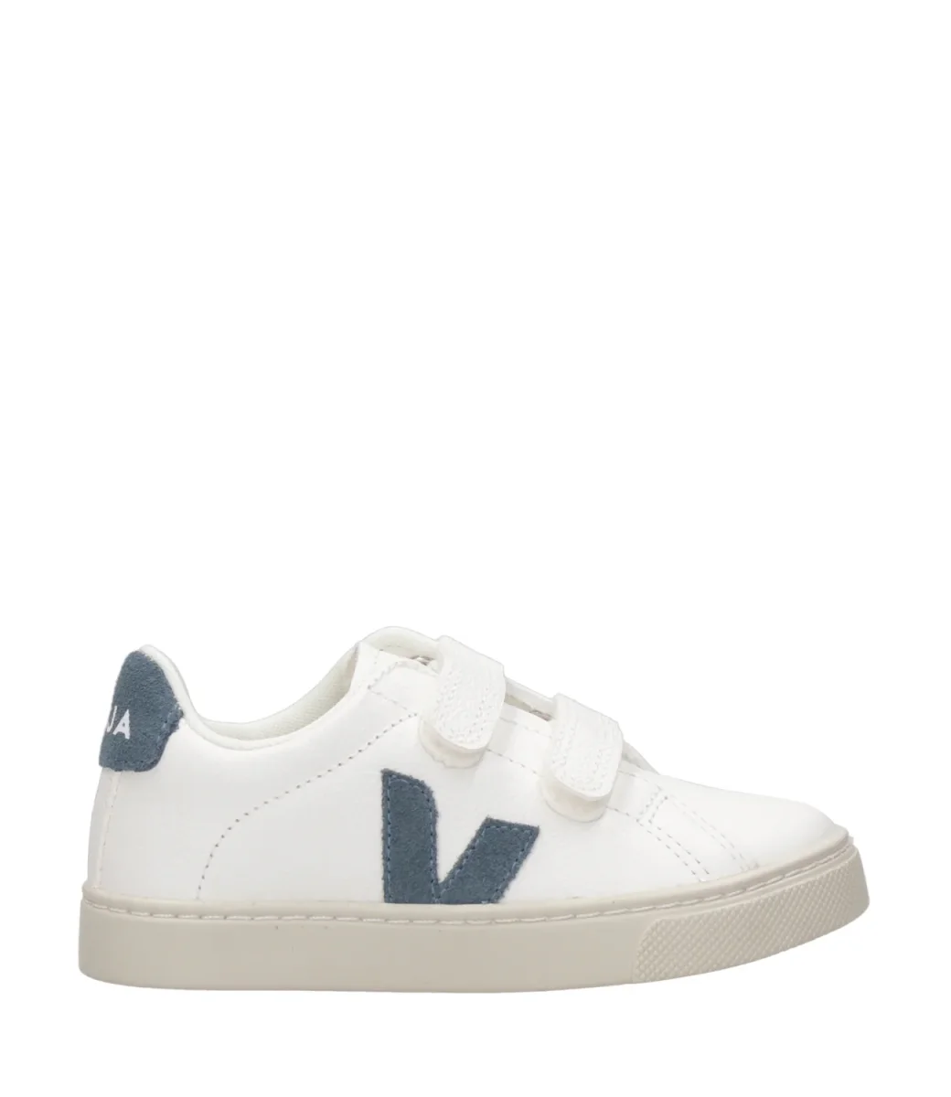 Sneakers Veja Kids Esplar realizzate con una combinazione di materiali ecologici e sostenibili come la tomaia in pelle chromefree bianca, dettagli in suede chromefree, logo V pietra in gomma e cascami di riso, punta tonda, strappi in pelle chromefree, soletta interna in canna da zucchero, cotone organico, gomma amazzonica ed EVA riciclata, suola in gomma amazzonica e cascami di riso.