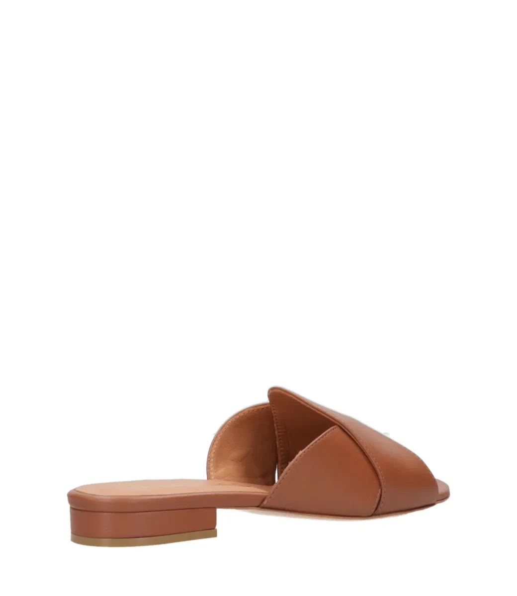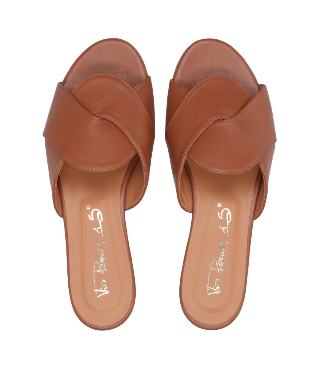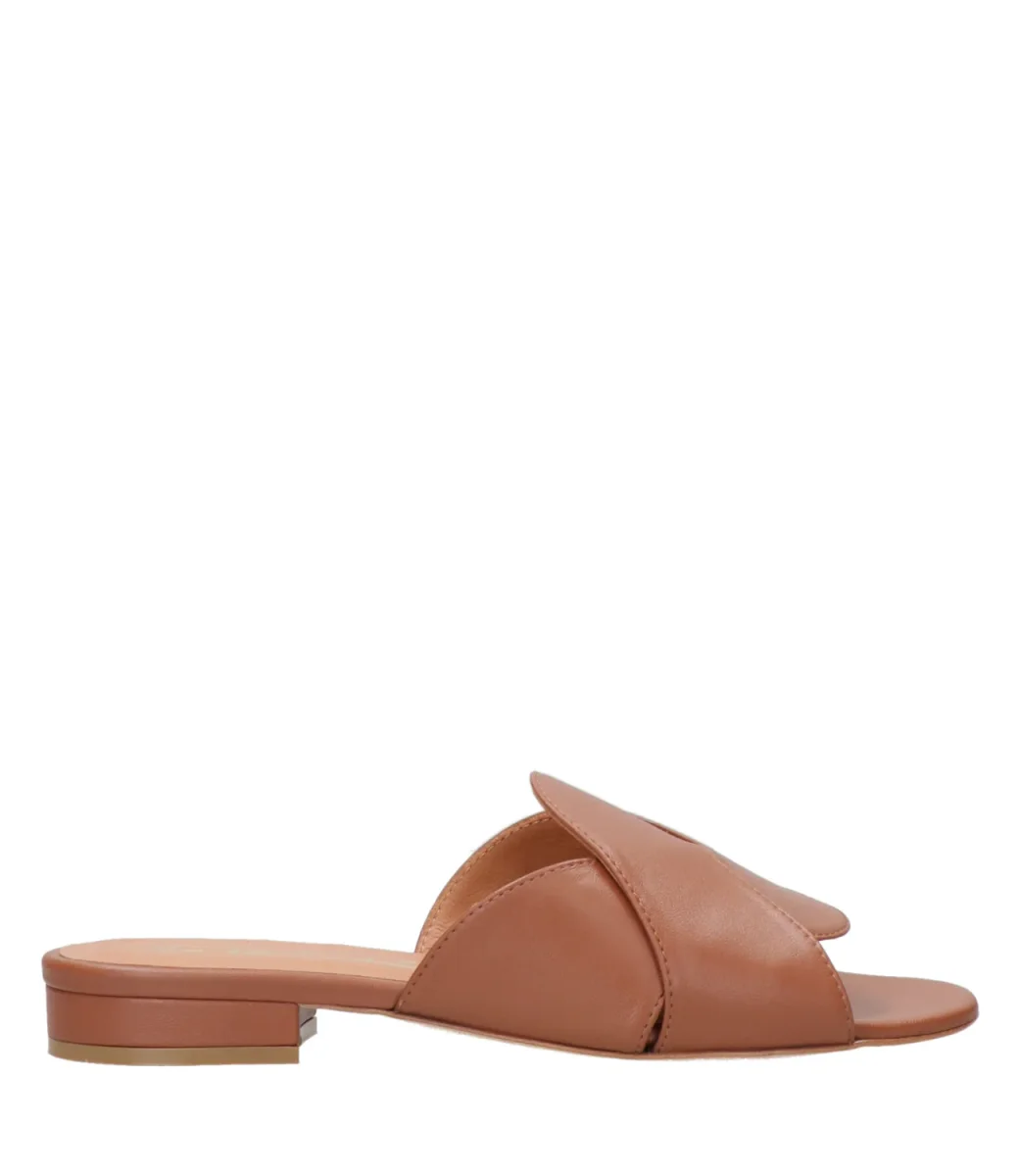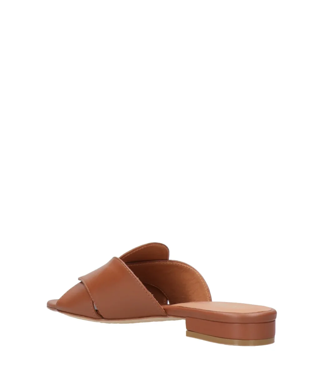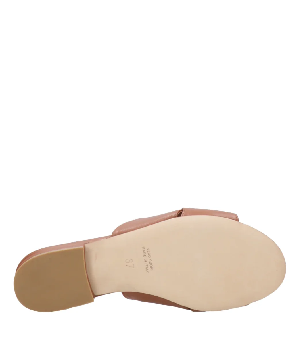 Ciabatta Via Roma 15 realizzata in cuoio, modello con doppia fascia con intreccio sul davanti e bordi stondati. suola in cuoio, tacco staccato.