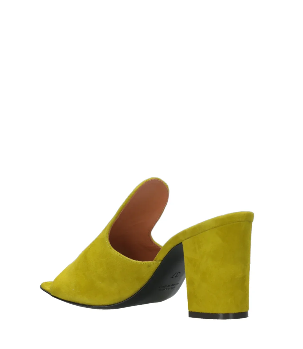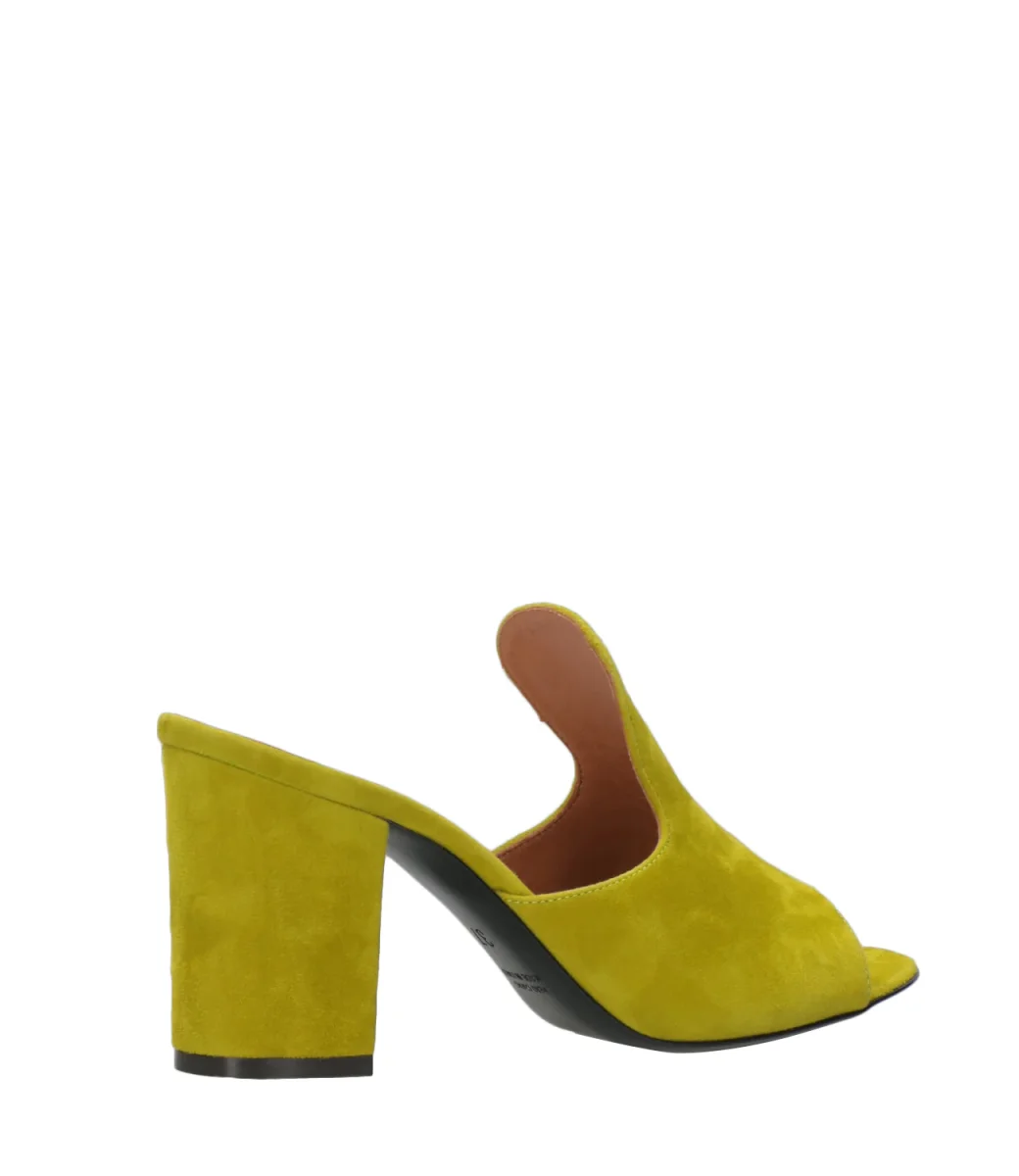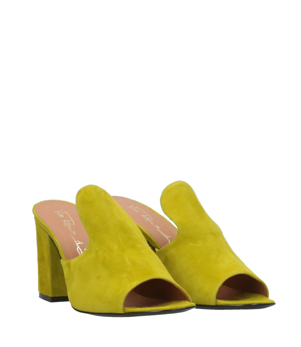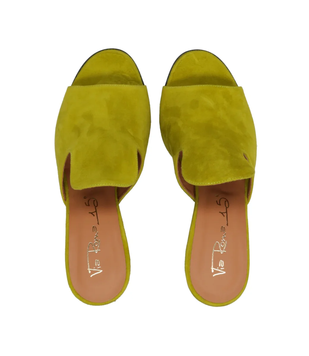 Ciabatta con tacco Via Roma 15 realizzata in suede. Sottopiede in pelle imbottito , suola in cuoio e tacco largo.