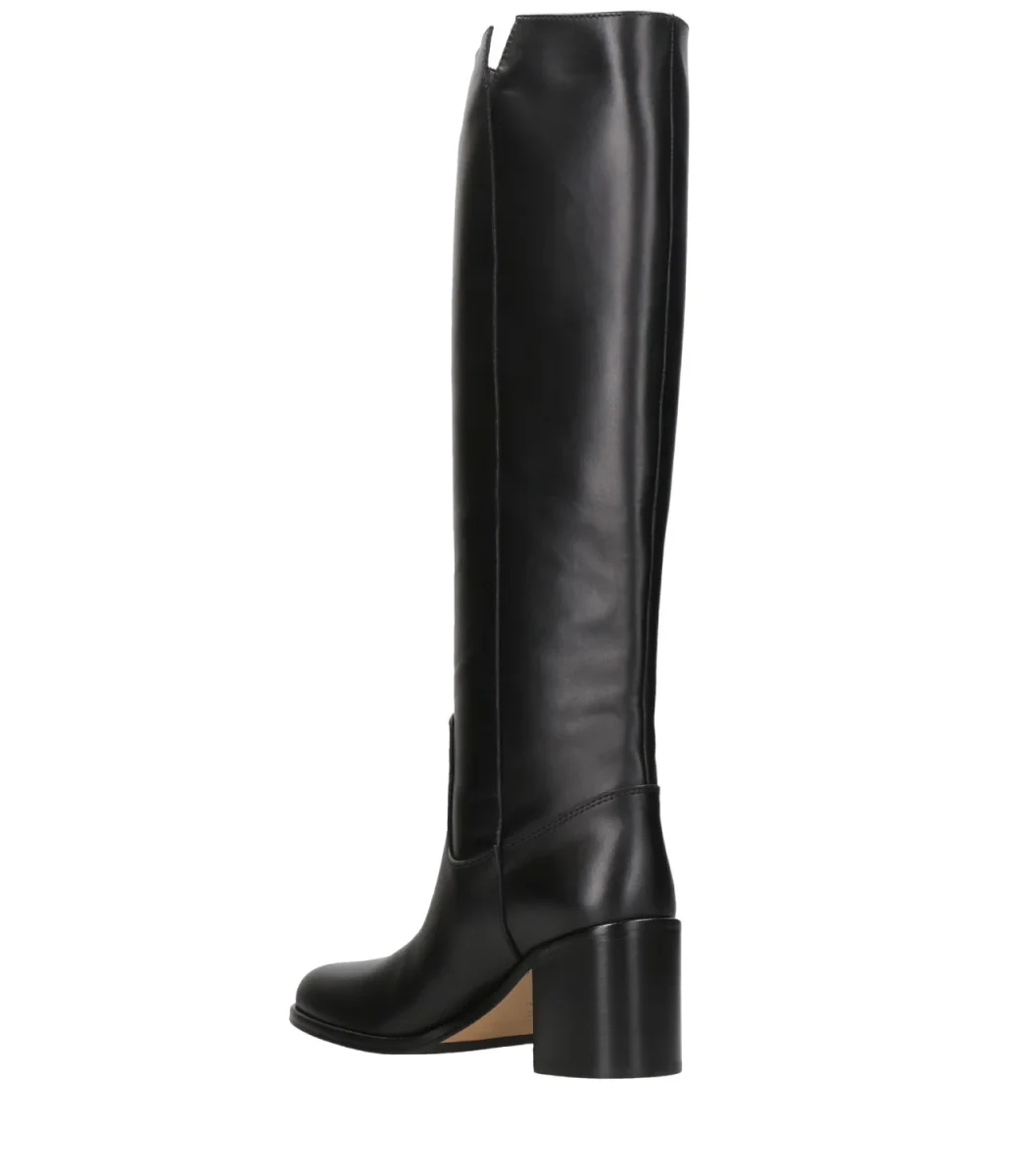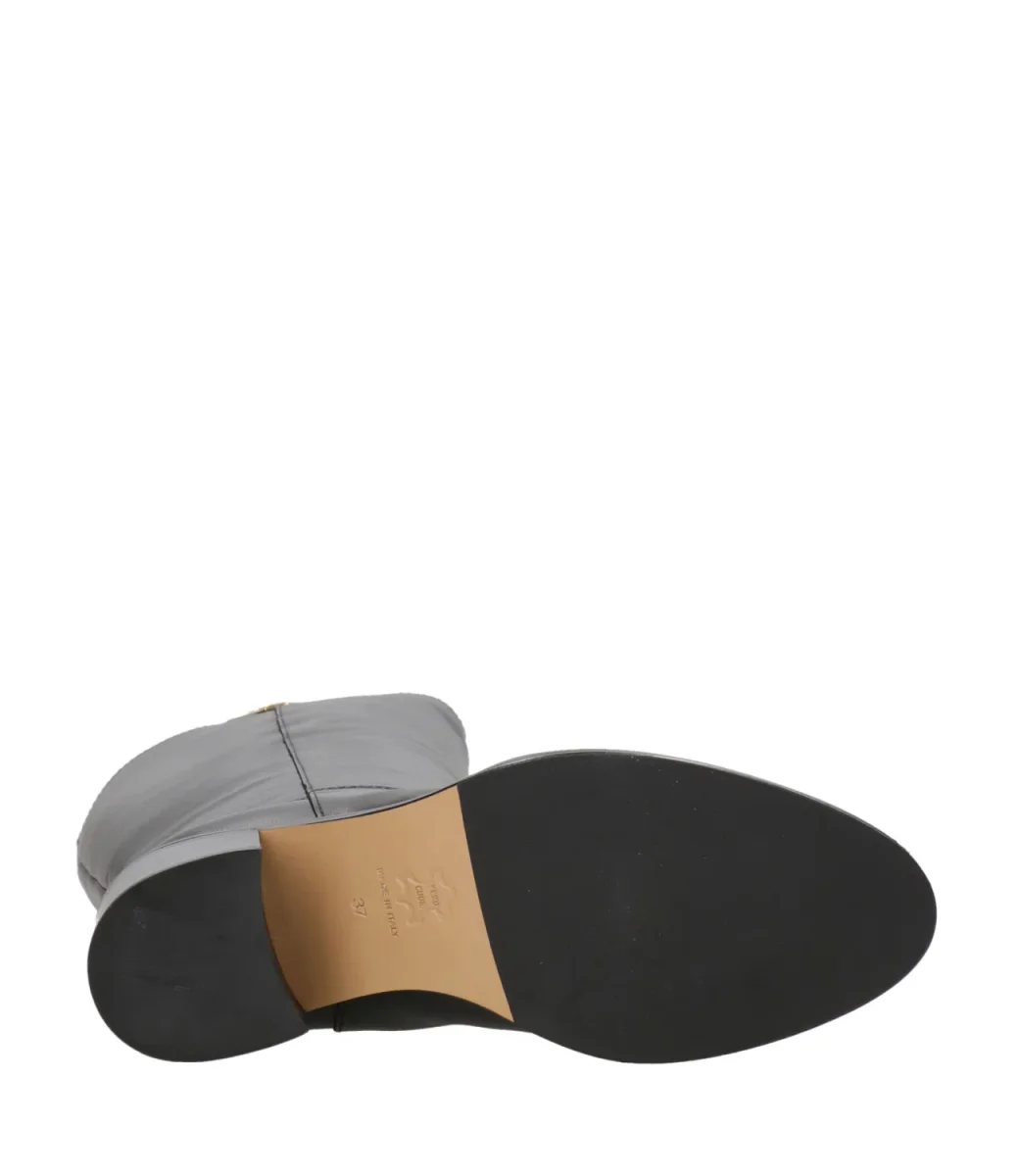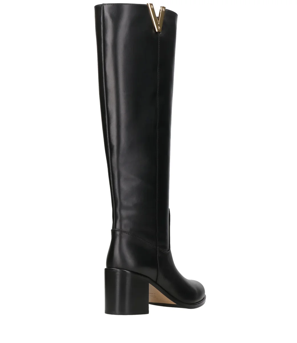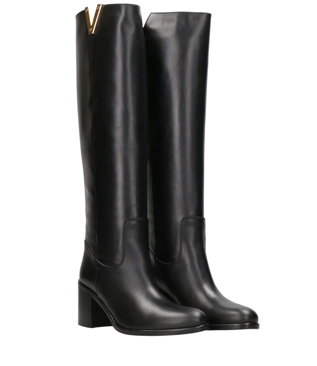 Stivale Via Roma 15 in pelle liscia, dettaglio sul bordo con V in metallo dorato, punta a mandorla, suola e tacco a strati.