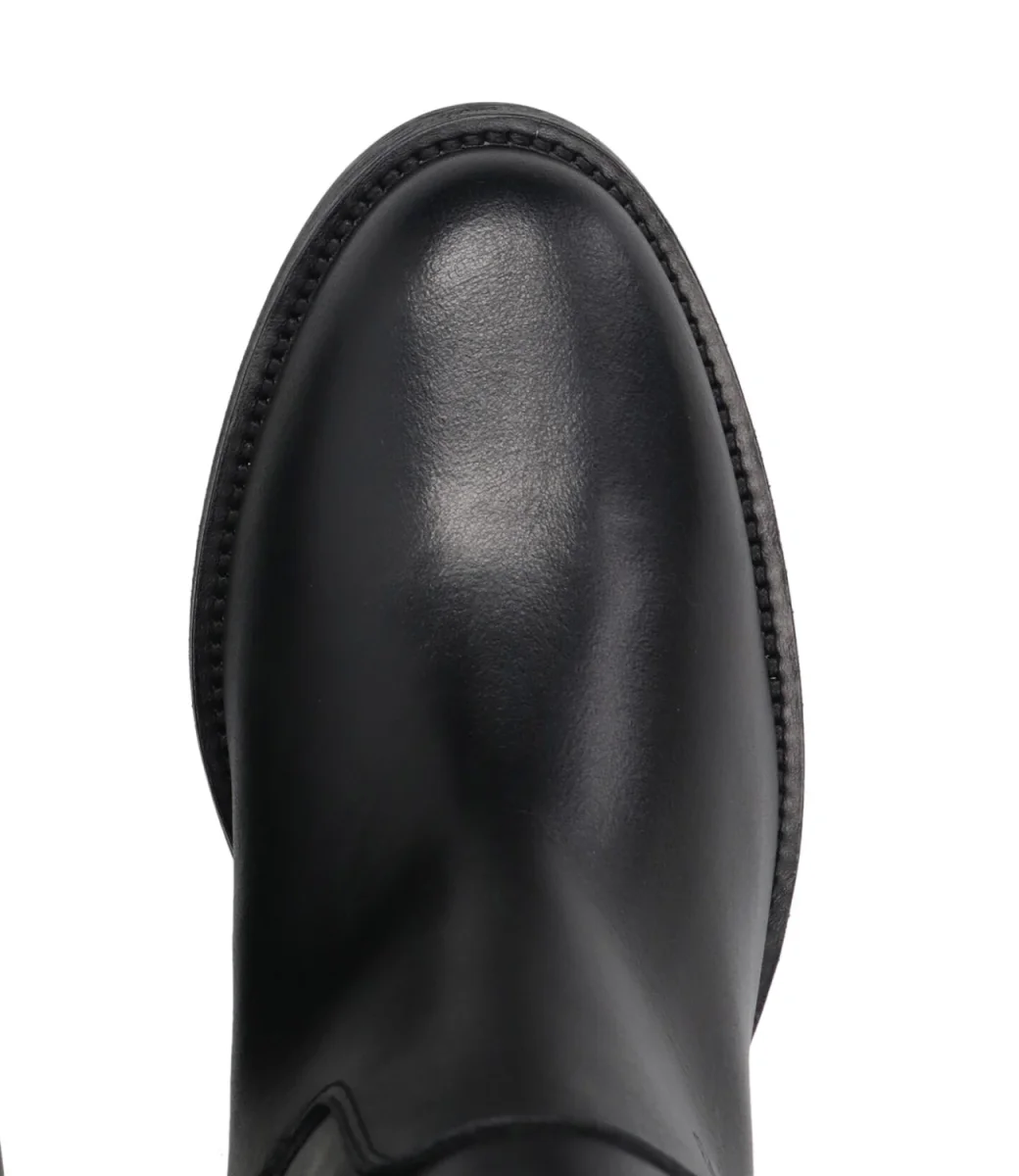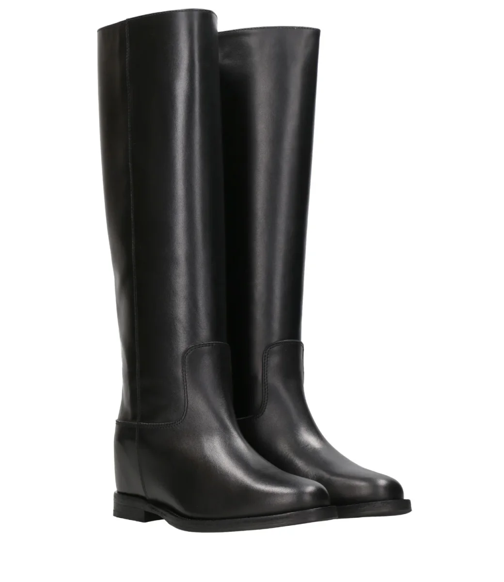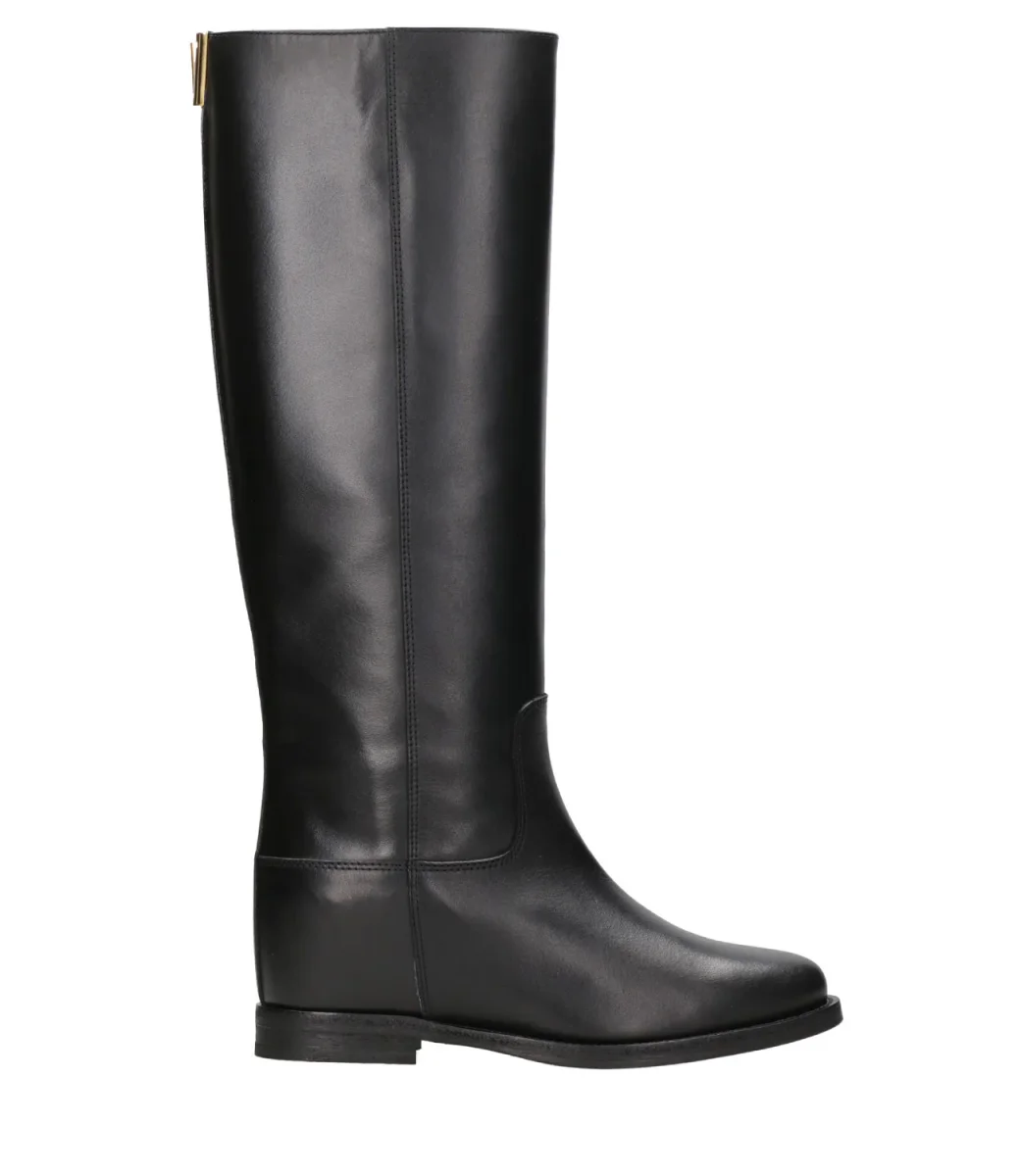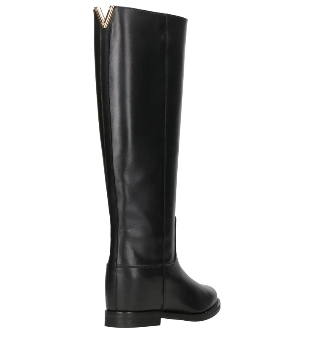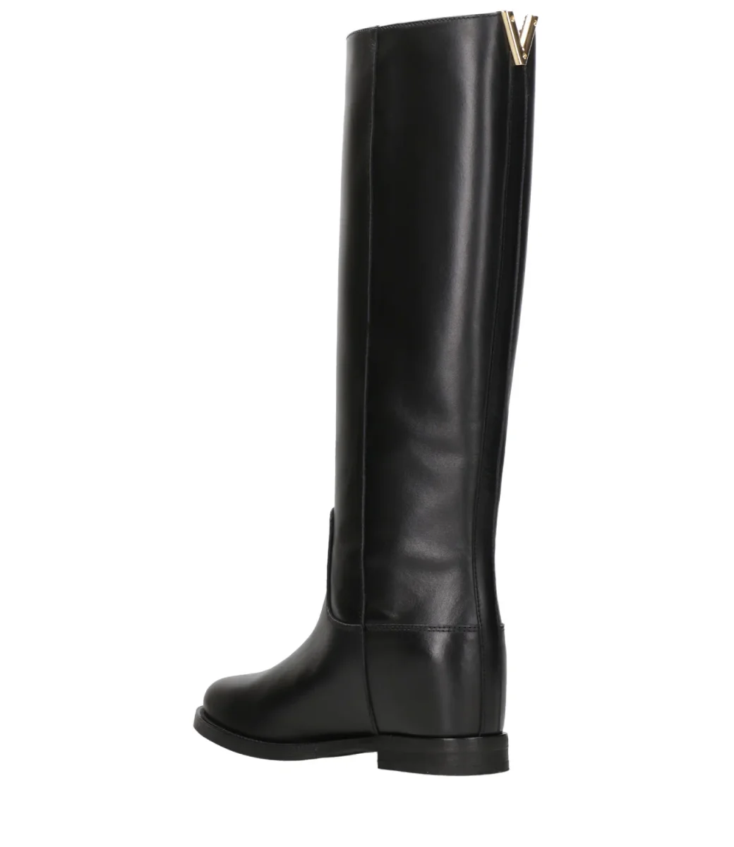 Stivale Via Roma 15 in pelle liscia, dettaglio sul bordo con V in metallo, zeppa interna, punta a mandorla, suola e tacco a strati.