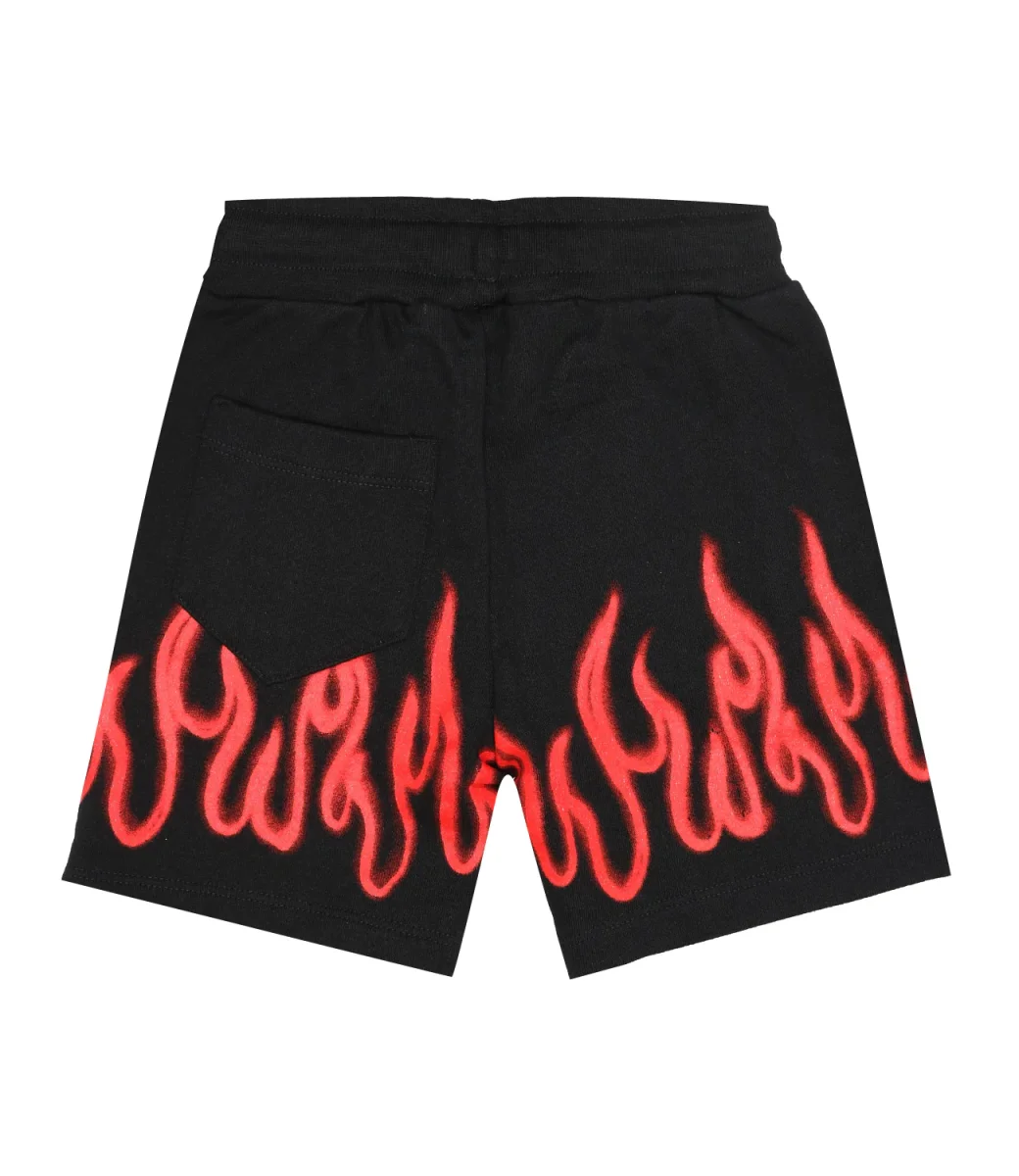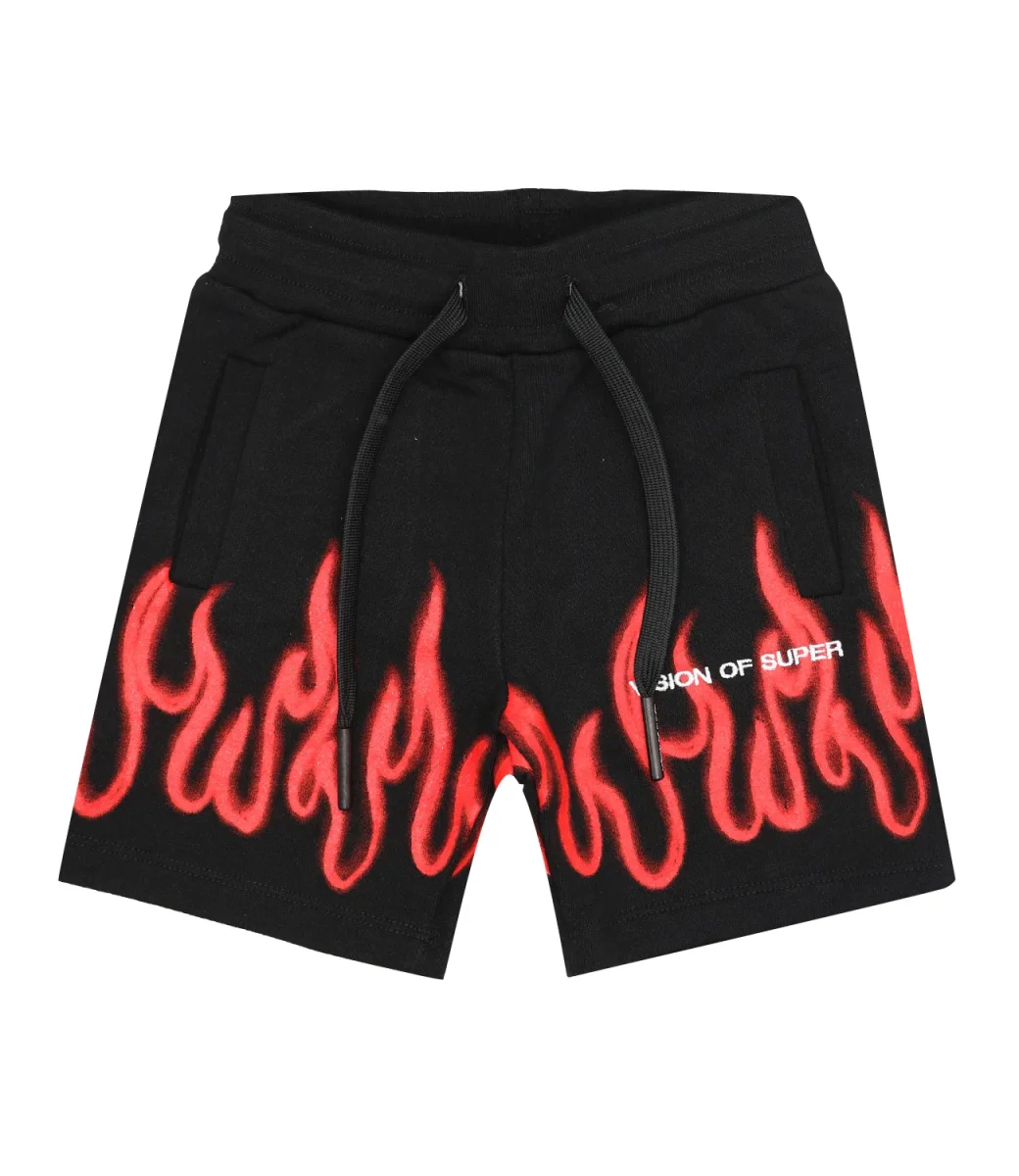 Pantalone sportivo Vision of Super in cotone nero con stampa serigrafica spray flames rossa a contrasto, vita elasticizzata con coulisse, tasche a filo laterali e logo Vision of Super ricamato sulla gamba sinistra.
