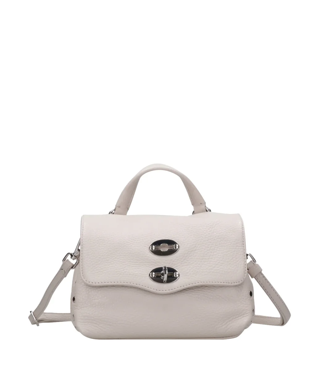 Postina Zanellato Daily Giorno Baby in pelle di vitello martellata, con doppia tracolla in pelle ed in tessuto jacquard regolabile rimovibile. Chiusura con patta, spazi interni, decorata con borchie.