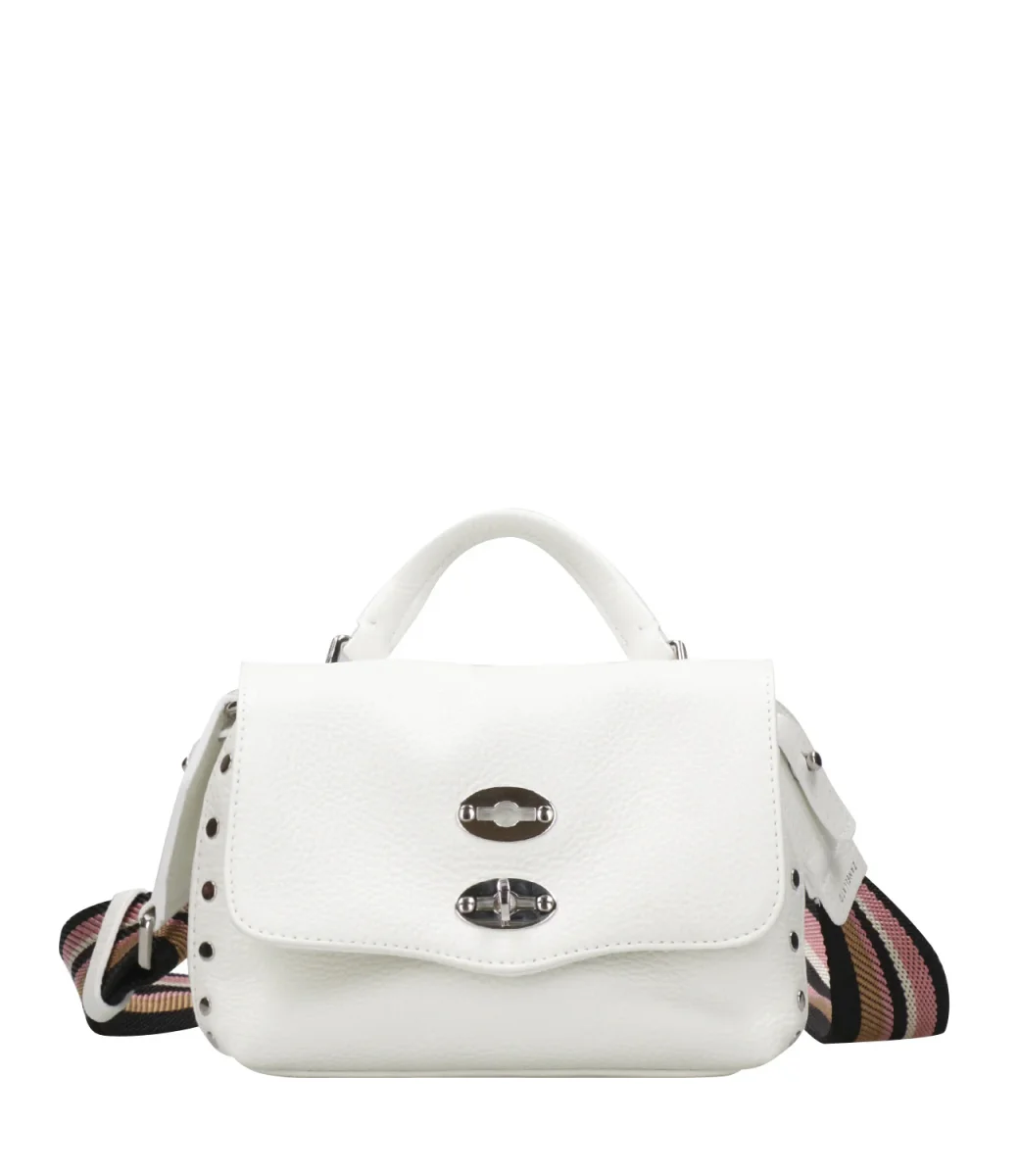 Postina Zanellato Daily Giorno Baby in pelle di vitello martellata, con doppia tracolla in pelle ed in tessuto jacquard regolabile rimovibile. Chiusura con patta, spazi interni, decorata con borchie.